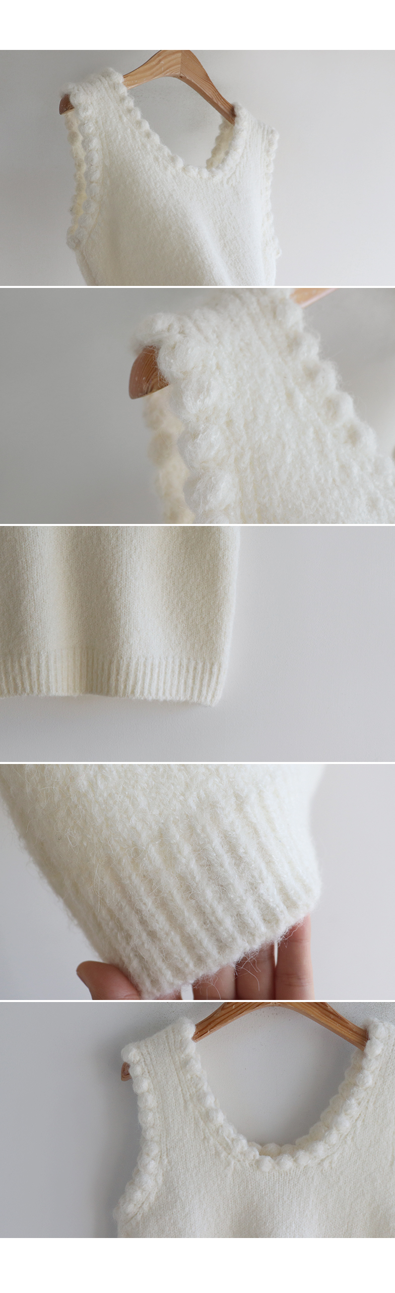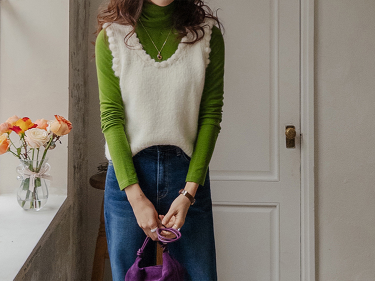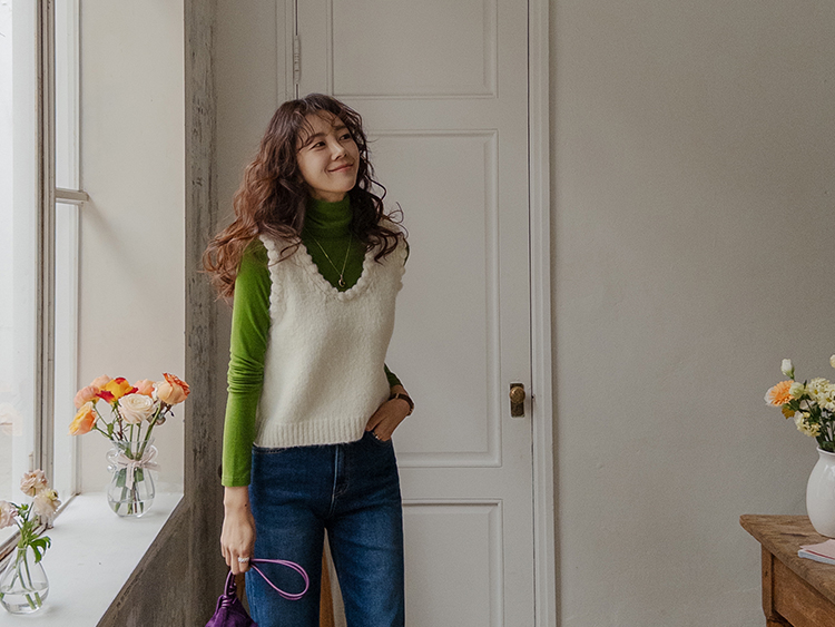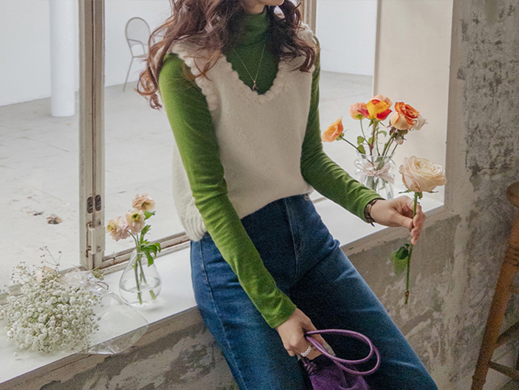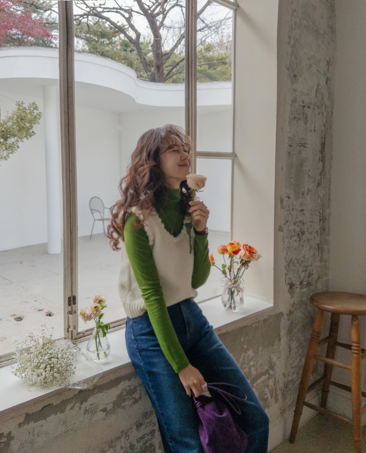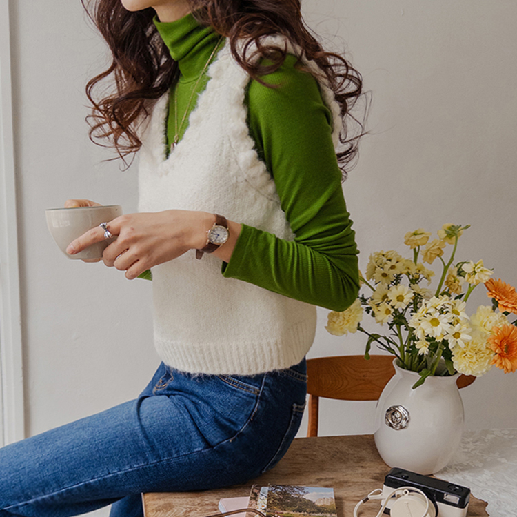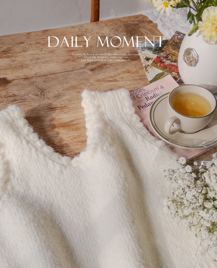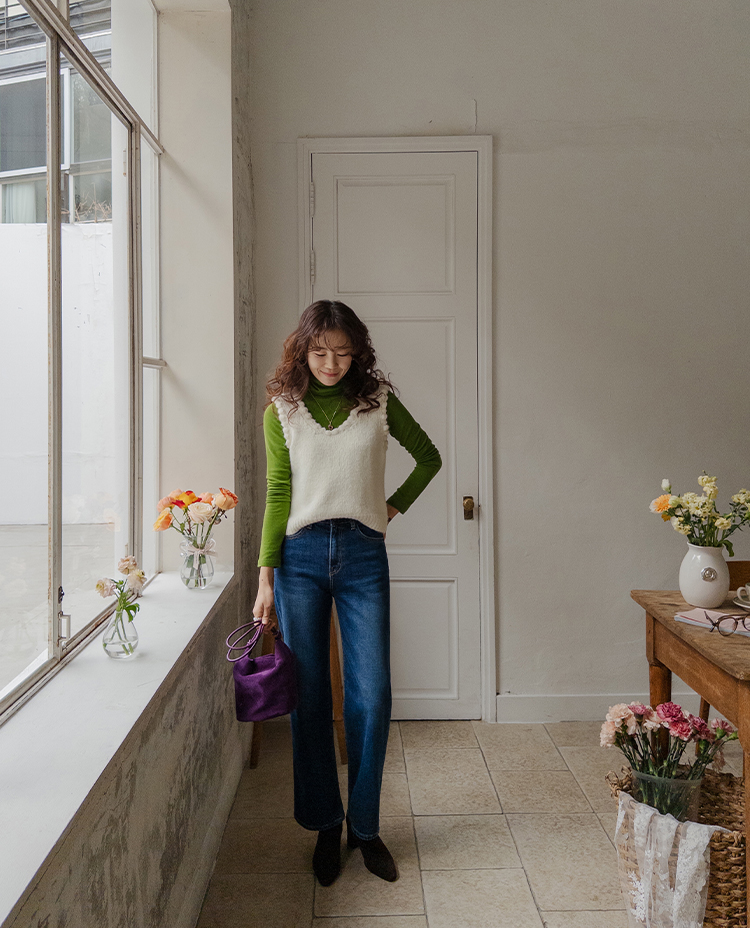 몽글몽글~ 넥&암홀부분에 마치 구름같이 넘 귀엽고 사랑스런 무드의 입체적인 물결쉐입이 포인트로 예쁜 니트 베스트 보여드려요! 요 니트는 램스울&알파카 혼방 원단으로 특유의 헤어감도 느껴지구요~ 끝단 디테일이 넘 예쁘고 유니크해서 레이어드코디로 정말 추천드리고 싶은 아이에요ㅎㅎ 넥라인이 살짝 내려와서 기본 티셔츠 안에 톡! 입어주시면 꾸민듯 자연스러운 무드로 연출되구요 모델언니처럼 롱한 길이감의 목걸이와 코디해도 넘 예쁜..♥ 폭닥한 터치감으로 겨울시즌에 찰떡으로 어울리구요 유니크한 디자인으로 요 베스트 하나로 스타일리쉬한 코디가 가능해서 레이어드템으로 하나쯤 소장하시길 강추드려요*.*