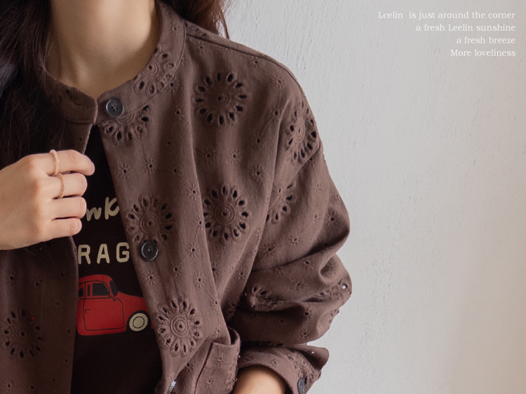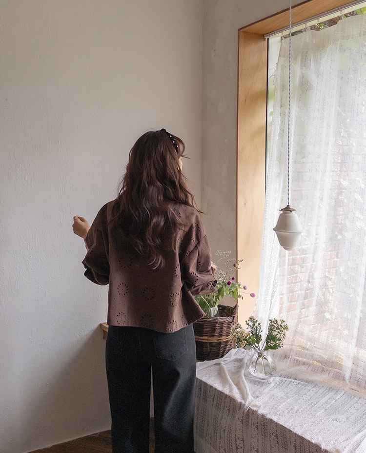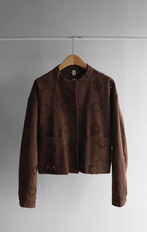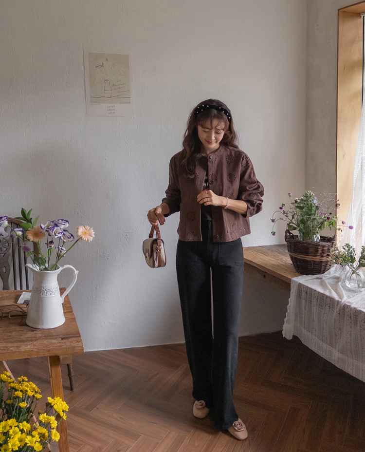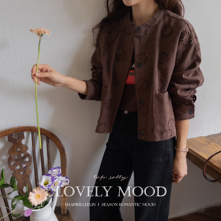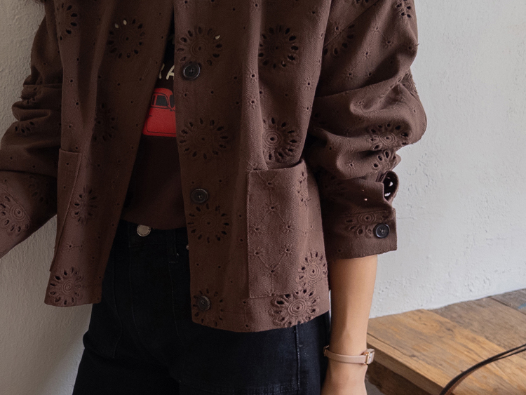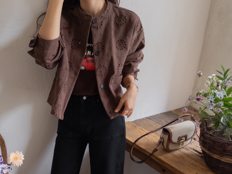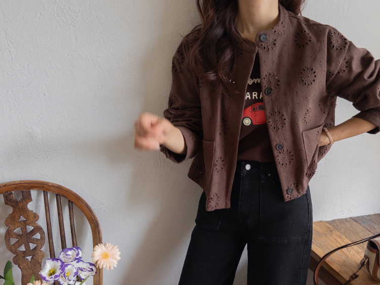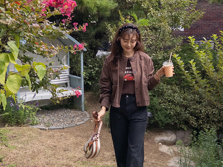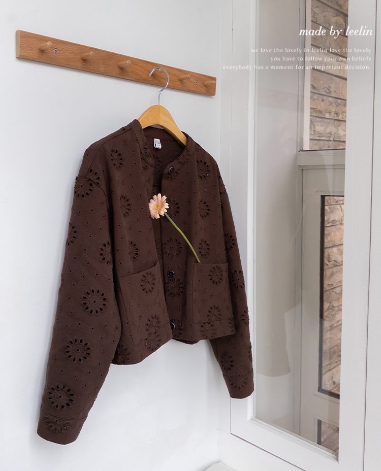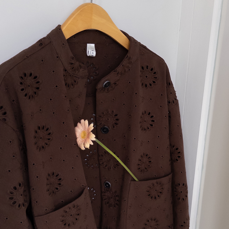탄탄한 코튼 소재에 펀칭 원단으로 가을무드 낭낭하면서도 리린감성이 물씬 느껴지는 LIN.MADE 코튼 자켓 보여드릴게요~! 요 자켓, 전체적으로 작고 큰 플라워 펀칭이 더해진 원단으로 그 자체만으로도 룩에 포인트가 되어주는데요ㅎㅎ 차분한 브라운 컬러이지만 원단으로 포인트가 되어서 룩에 특별함을 더해주는데다 적당한 두께감의 탄탄한 코튼 소재로 지금시즌에 딱 즐기기 좋은 그런 자켓이랍니다~! 적당히 크롭하게 떨어지고 여유있는 실루엣으로 편하게 착용하기 좋은건 물론이구요 가을시즌에 딱 예쁘게 어울리는 톤&아웃핏으로 하나 소장하시면 데님 & 스커트에 모두 예쁘게 어울리는 그런 자켓으로 매일매일 함께하시기 좋으실거에요-♡