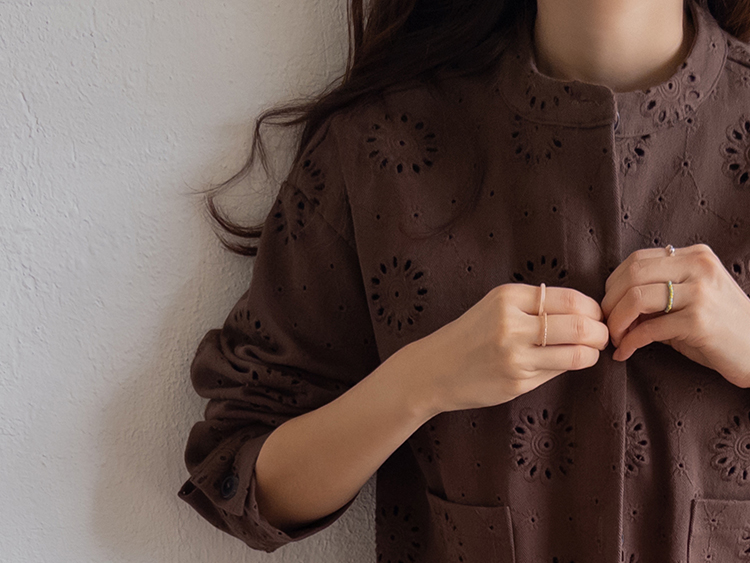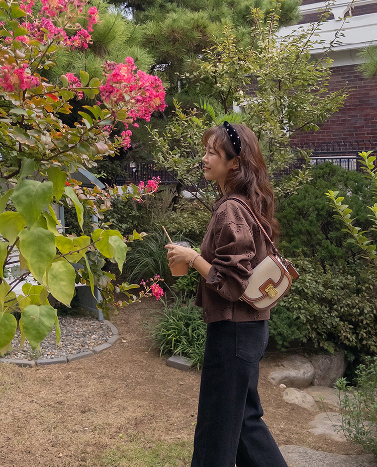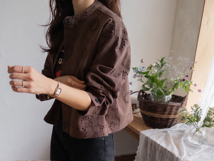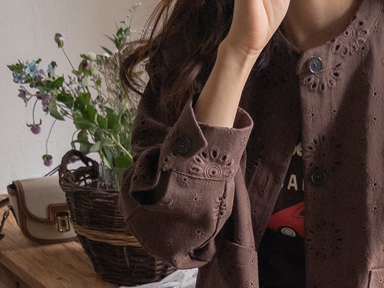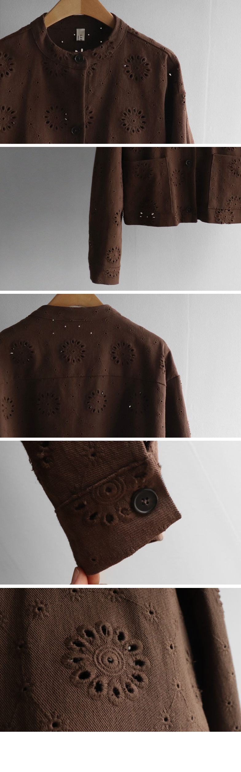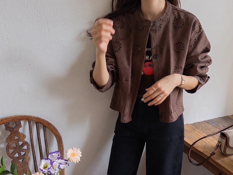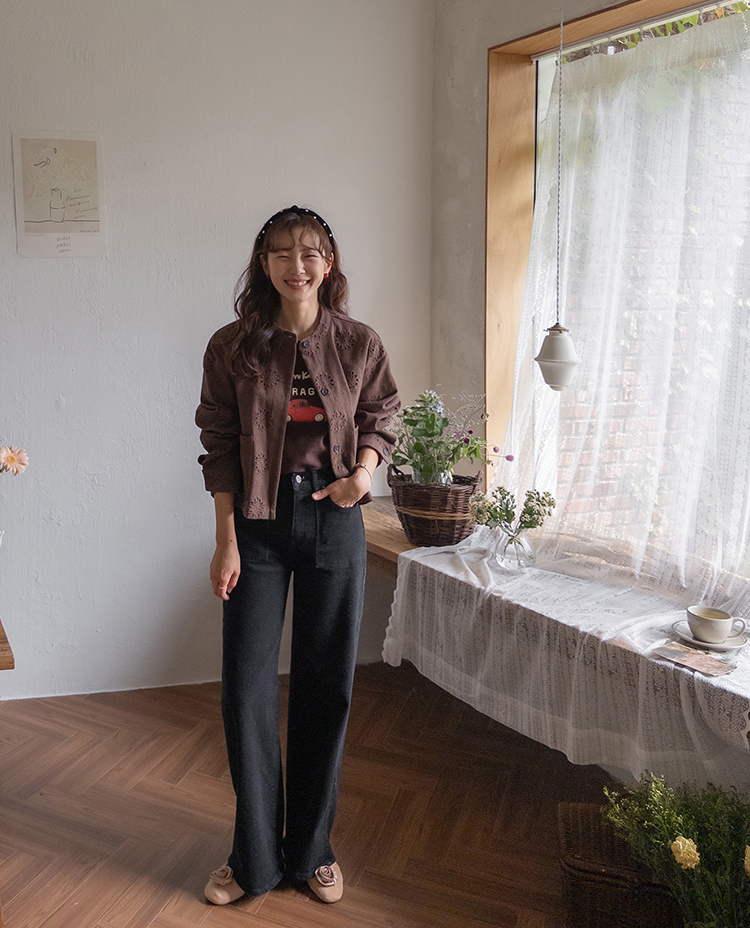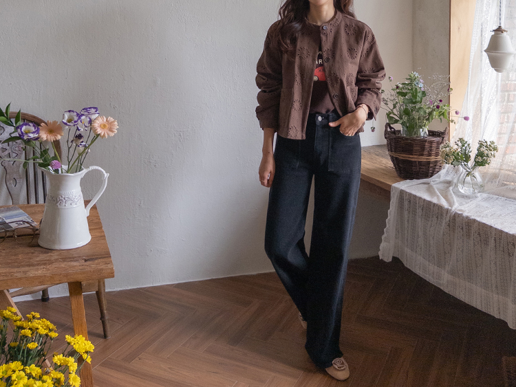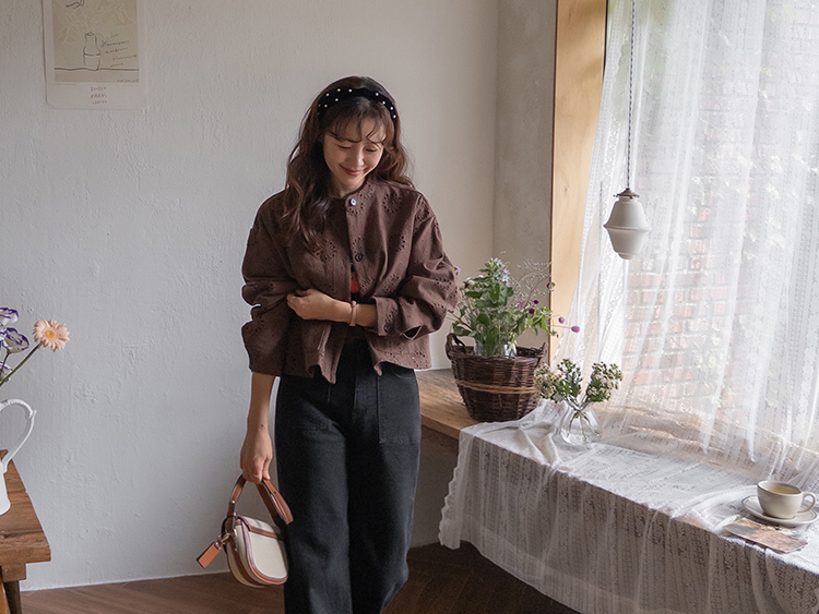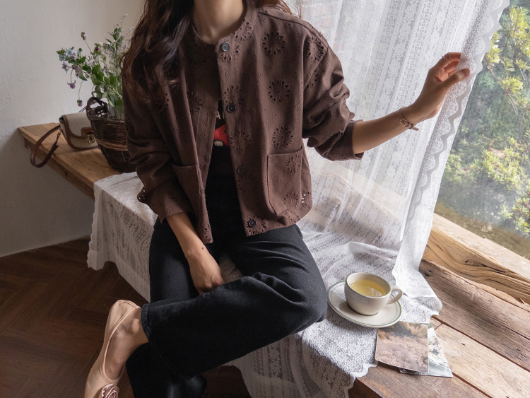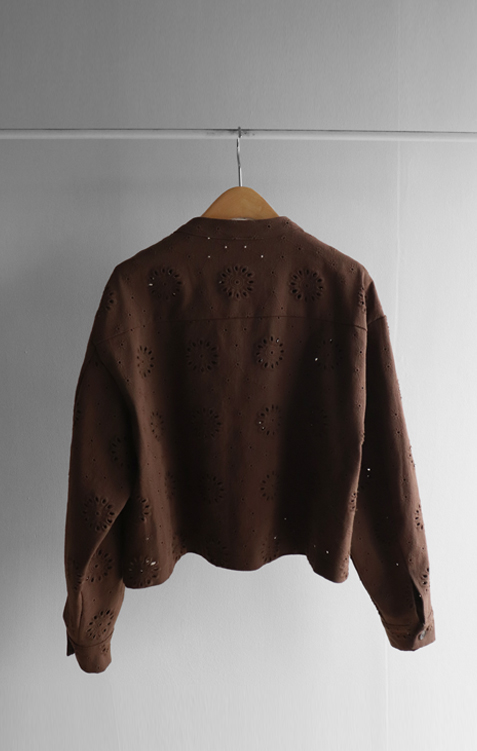 탄탄한 코튼 소재에 펀칭 원단으로 가을무드 낭낭하면서도 리린감성이 물씬 느껴지는 LIN.MADE 코튼 자켓 보여드릴게요~! 요 자켓, 전체적으로 작고 큰 플라워 펀칭이 더해진 원단으로 그 자체만으로도 룩에 포인트가 되어주는데요ㅎㅎ 차분한 브라운 컬러이지만 원단으로 포인트가 되어서 룩에 특별함을 더해주는데다 적당한 두께감의 탄탄한 코튼 소재로 지금시즌에 딱 즐기기 좋은 그런 자켓이랍니다~! 적당히 크롭하게 떨어지고 여유있는 실루엣으로 편하게 착용하기 좋은건 물론이구요 가을시즌에 딱 예쁘게 어울리는 톤&아웃핏으로 하나 소장하시면 데님 & 스커트에 모두 예쁘게 어울리는 그런 자켓으로 매일매일 함께하시기 좋으실거에요-♡