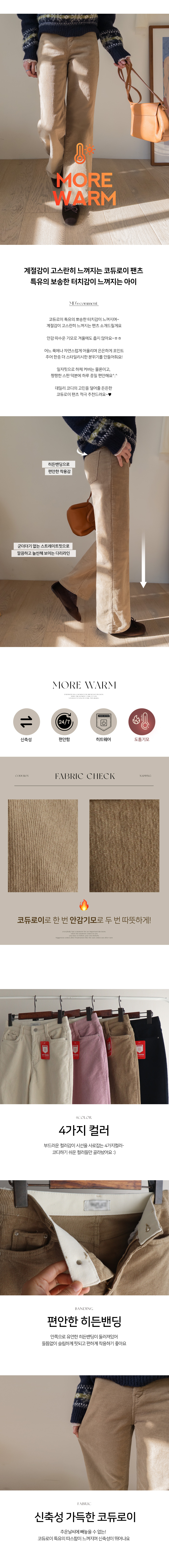 코듀로이 특유의 뽀송한 터치감이 느껴지며~ 계절감이 고스란히 느껴지는 팬츠 소개드릴게요 안감 따수운 기모로 겨울에도 춥지 않아요~ㅎㅎ 어느 룩에나 자연스럽게 어울리며 은은하게 포인트 주어 한층 더 스타일리시한 분위기를 만들어줘요! 일자핏으로 하체 커버는 물론이고, 짱짱한 스판 덕분에 하루 종일 편안해요^.^ 데일리 코디의 고민을 덜어줄 든든한 코듀로이 팬츠 적극 추천드려요~♥