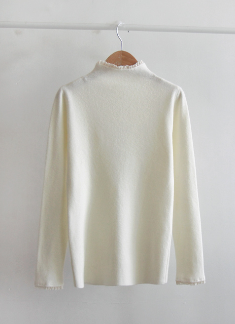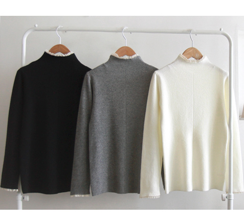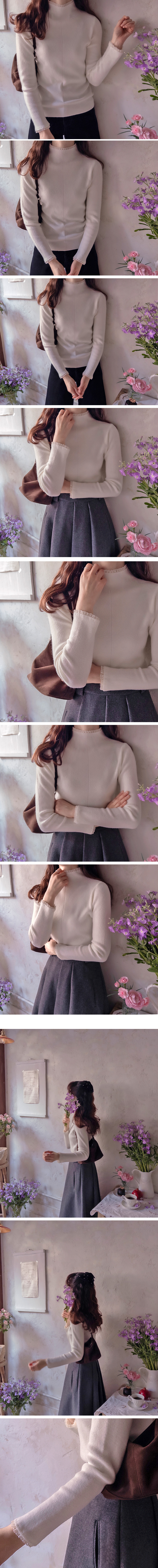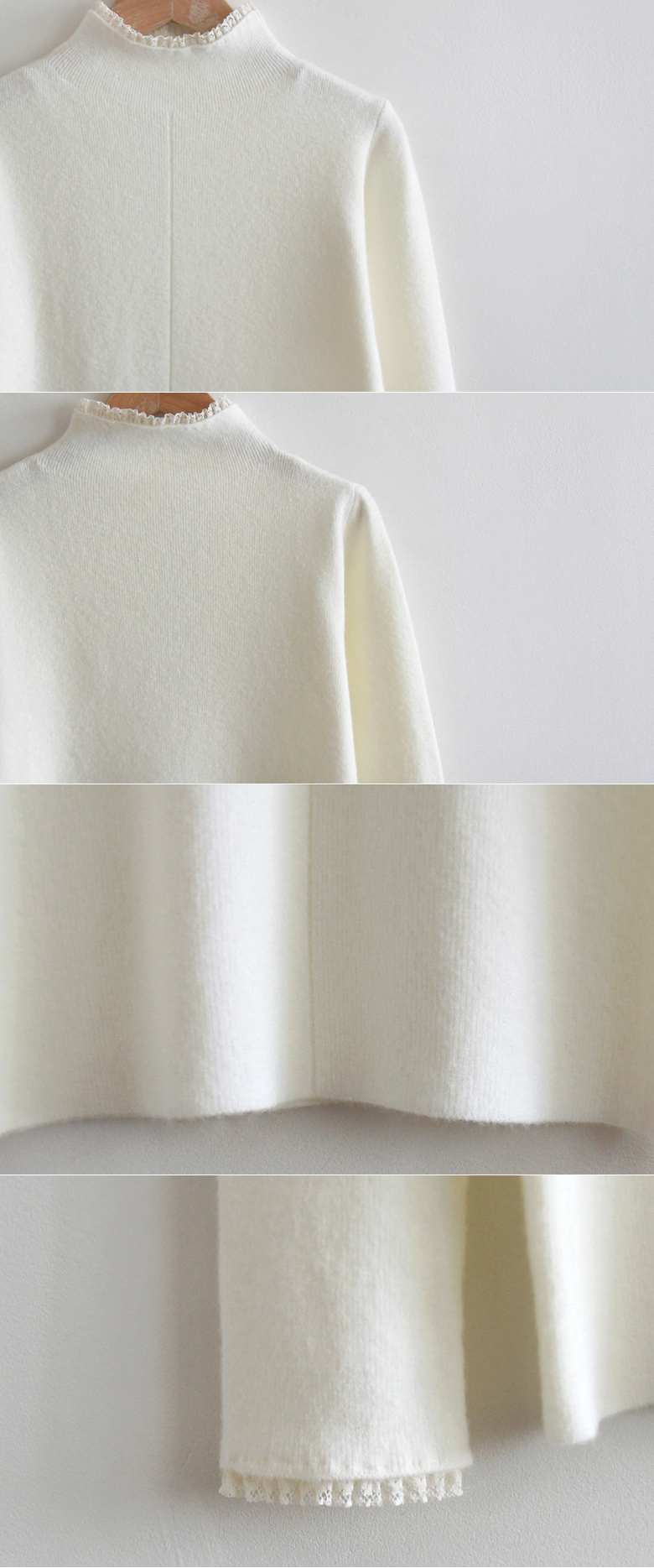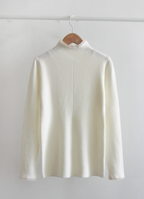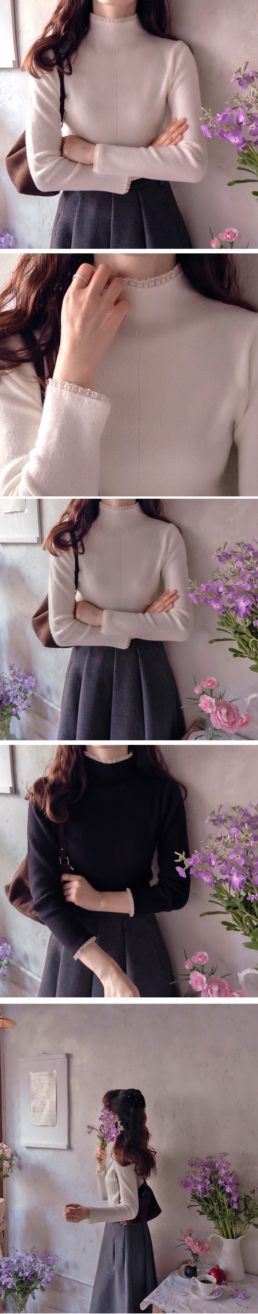 부드럽고 신축성 좋은 원단이라~ 넥과 레이스가 과하지 않는 디자인이 사랑스러운 니트랍니다~ 겉옷의 매무새를 망치지 않고~