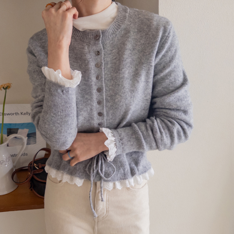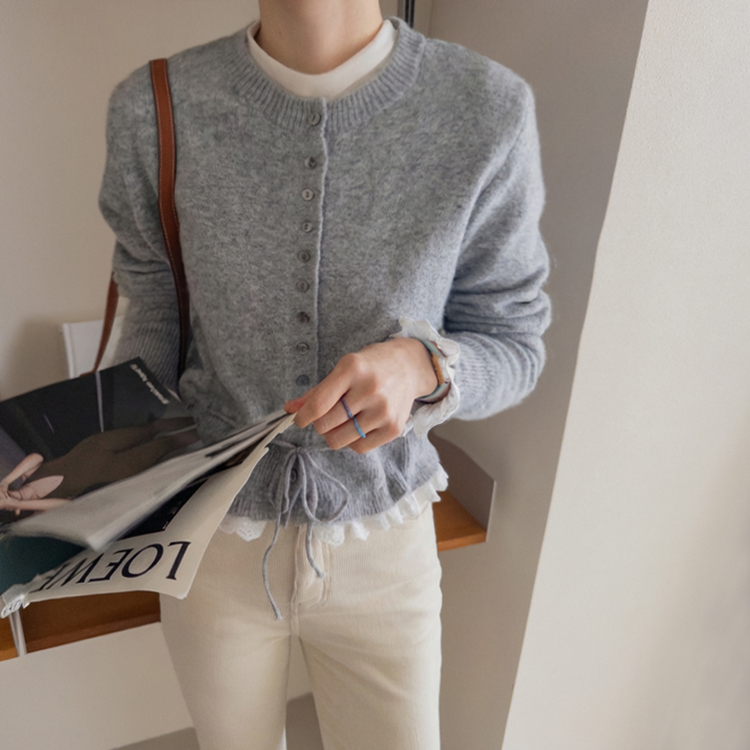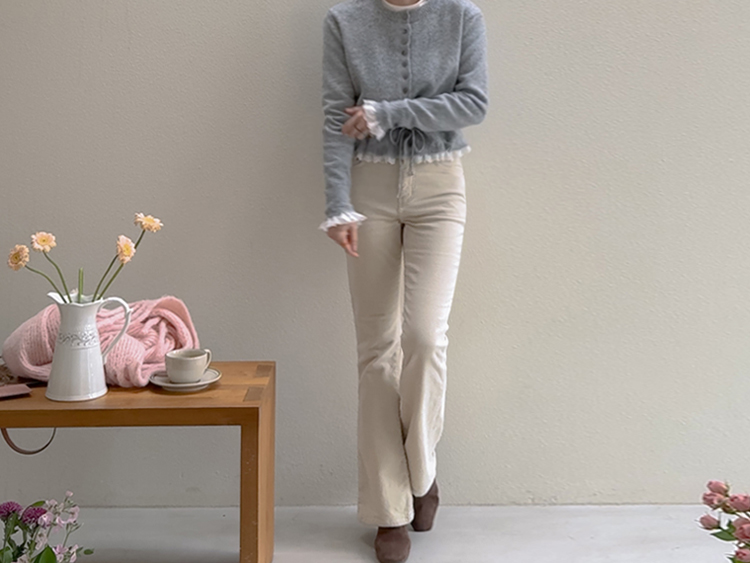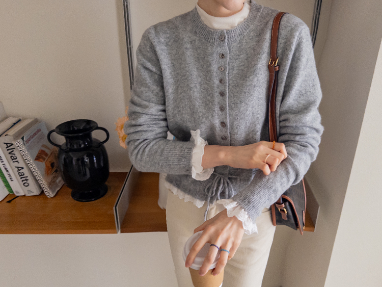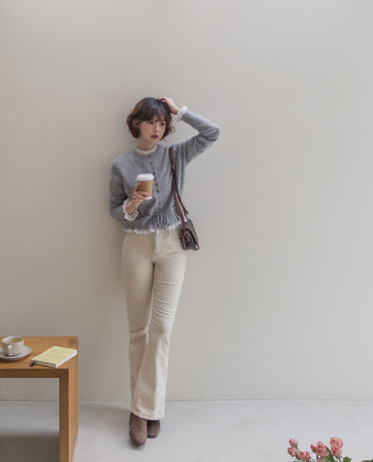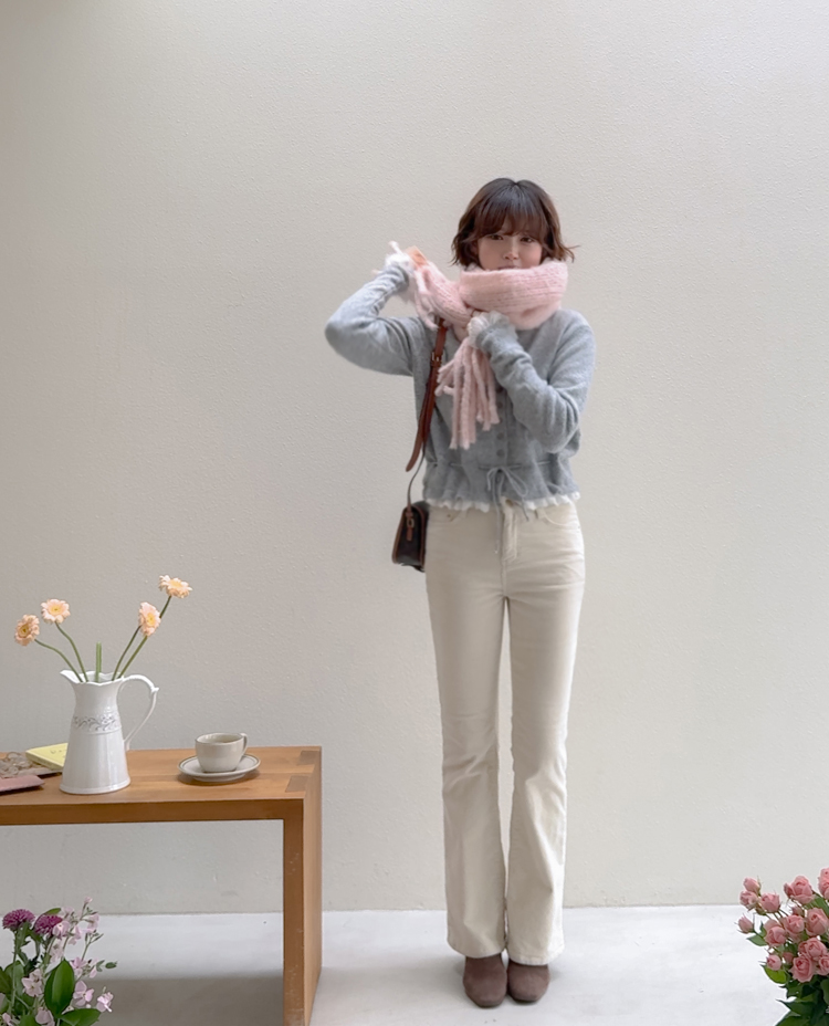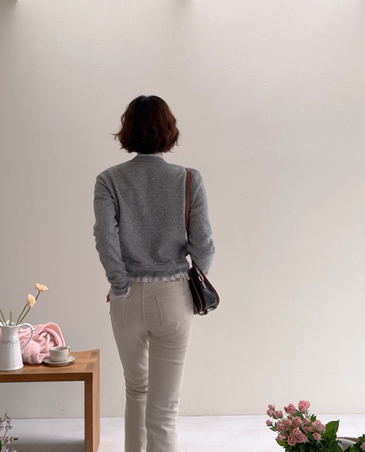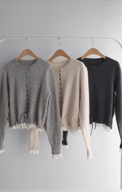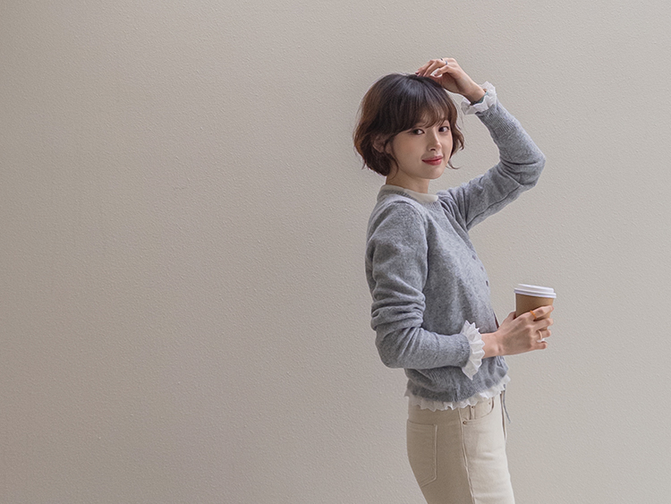 보는 순간 페미닌하고 러블리한 감성이 가~득 느껴지는 니트 가디건 이에요~^^💕 소매와 밑단에 더해진 프릴 디테일이 러블리하면서도 여성스러운 분위기를 연출해준답니다! 허리 끈 디테일이 있어 부해보임 없이 라인을 살려 더욱 여성스러운 실루엣 완성♡ 울블랜드 소재로 부드럽고 포근한 터치감이구요~☁️ 두껍지 않은 원단이라 겨울에도 가볍게 툭 걸치기 좋아서 데일리룩부터 데이트룩까지 활용도 GOOD~♥*.*♥ 러블리한 포인트들로 단독으로 입어도 예쁘고 이너와 함께 레이어드 해도 분위기가 살아나는 아이템이랍니다!^^