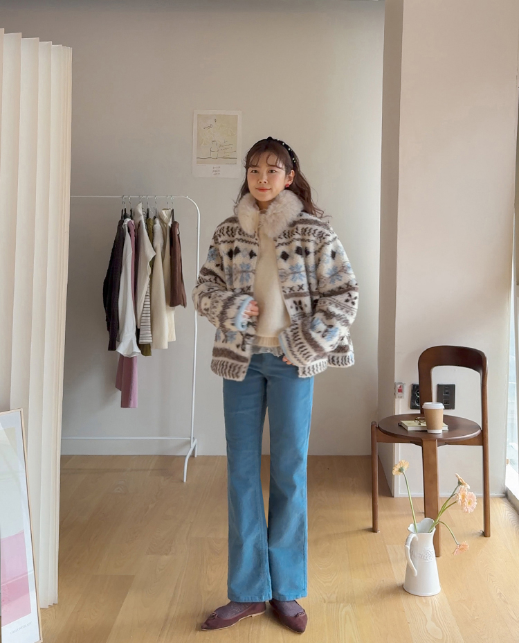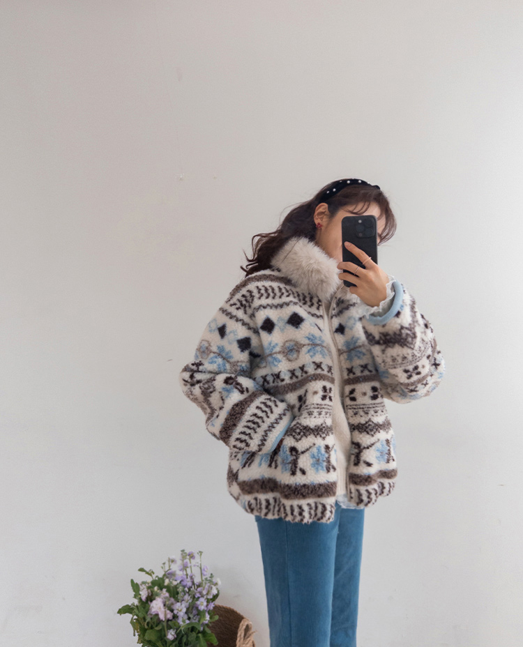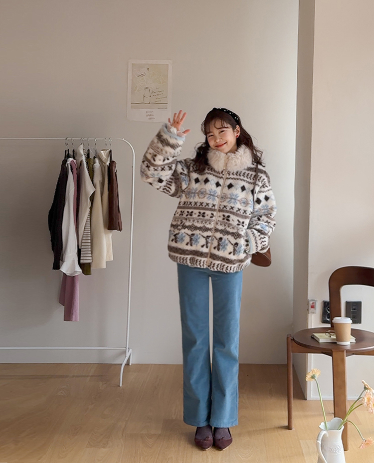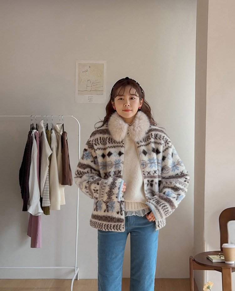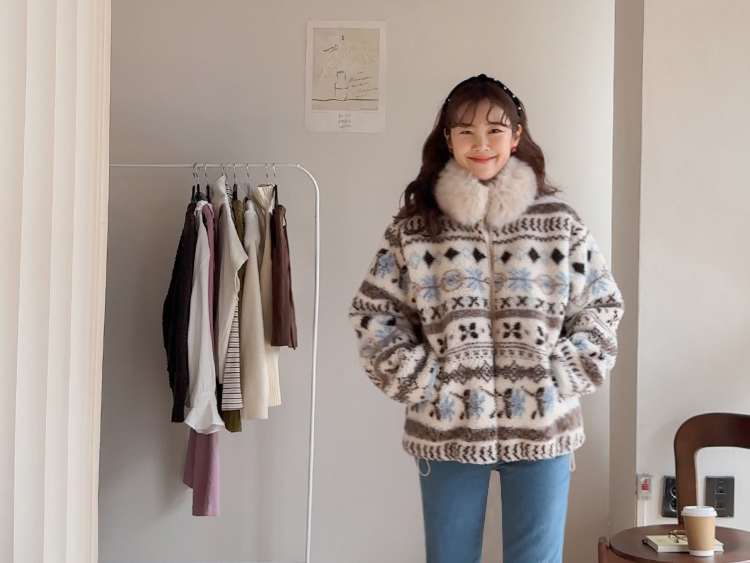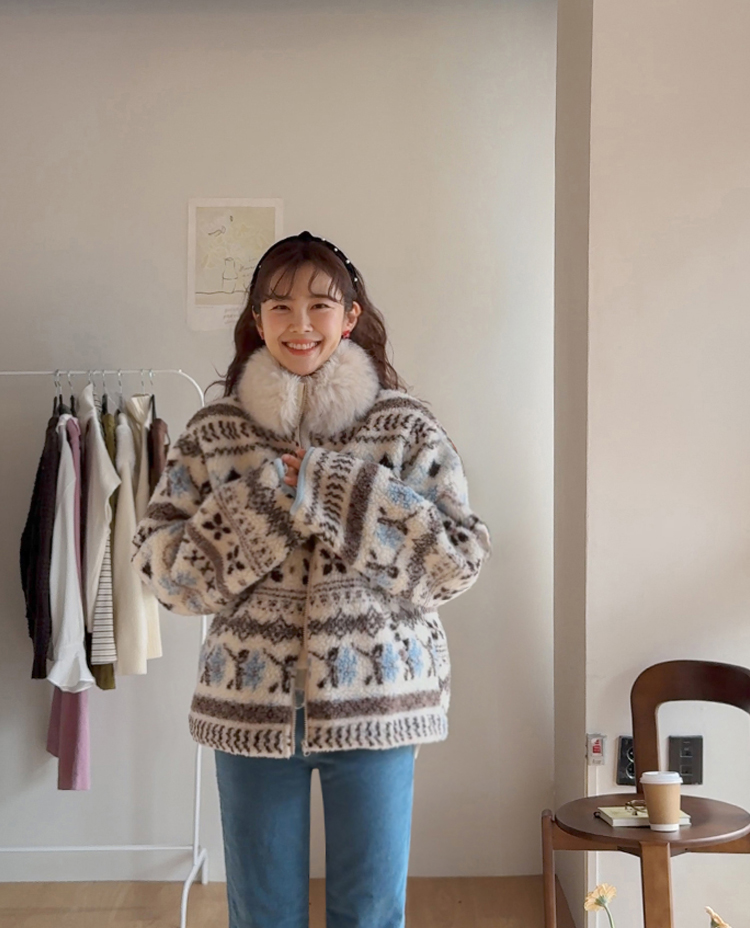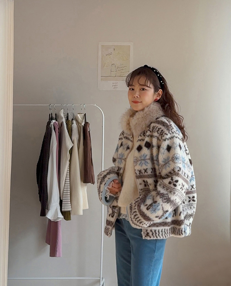 몽글~몽글 포근함이 가득 느껴지는 플리스 점퍼 보여드릴게요~^.^ 퍼 카라는 탈부착이 가능해서 두가지 연출이 가능하다는 점이 너무 좋았어요! 겨울 분위기를 맘껏 느껴볼 수 있는 노르딕 패턴으로 스타일리시함은 UP~! 살짝 여유로운 실루엣으로 도톰한 이너와도 부담없이 편안하게 즐길 수 있어요ㅎㅎ 데일리는 물론, 따뜻하게 포인트 주고 싶은 날 플리스 점퍼로 스타일리시한 룩 완성해 보아요~♡