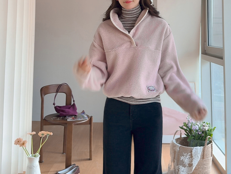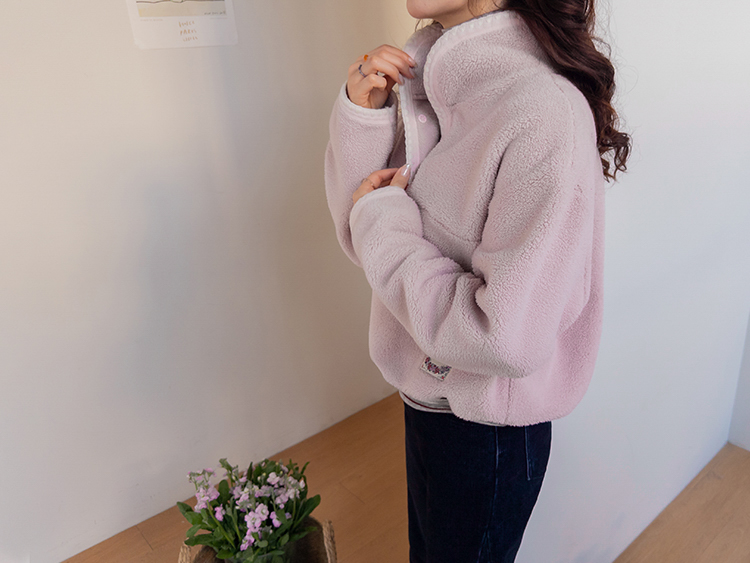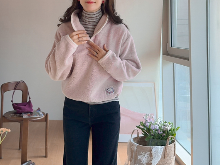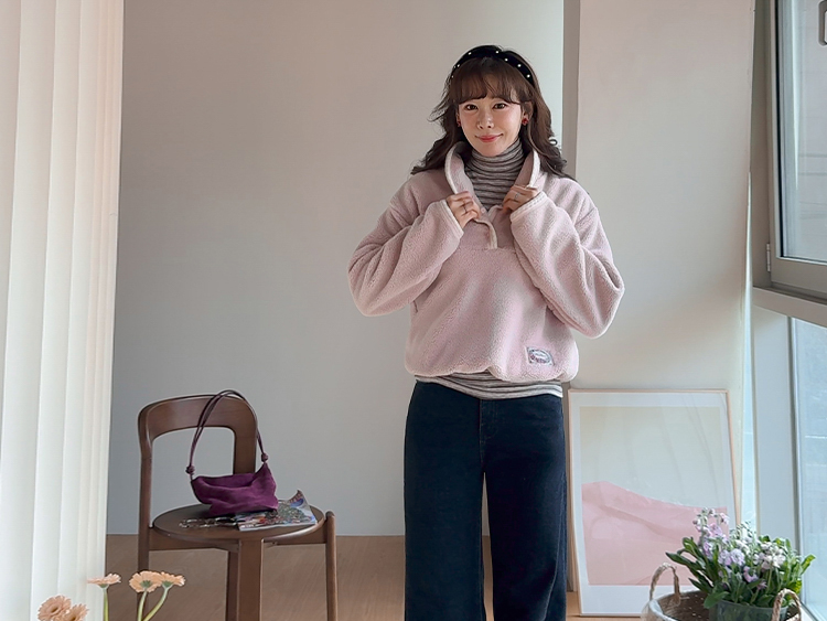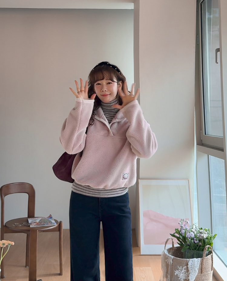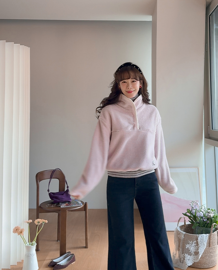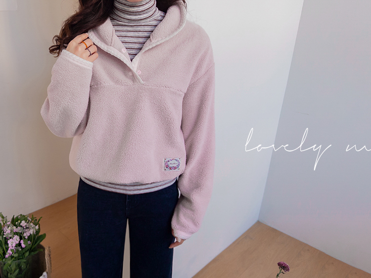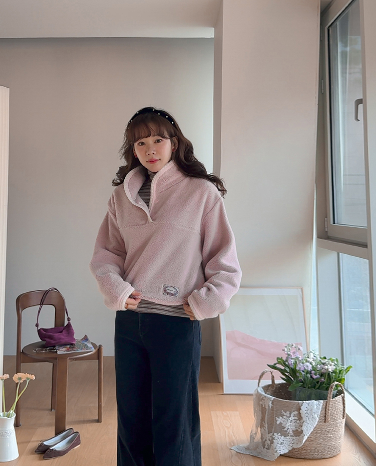 보들보들~ 넘 보드랍고 도톰한 플리스 소재로 겨울내내 귀엽고 따듯하게 착용될 반집업 후리스 보여드려요ㅎㅎ 요 아이, 겨울에 뭘 입어도 추우셨던 분들에게 정말 추천드리고 싶어요~ 도톰한 두께감의 후리스 원단에 보드라운 터치감까지 더해져서 넘 편하고 귀여운 그런 반집업 맨투맨이에요! 원단도 좋지만 디자인도 정말 귀여운데요 둥근 카라 디자인에 반집업 형식인데요 버튼도 컬러를 맞춰주어서 사랑스럽고 귀여운 포인트가 되어주고 똑딱이 버튼으로 달아주어서 간편한 오픈클로징이 가능해요:) 또 카라부분에 자수 트리밍을 더해주어서 사랑스러운 디테일도 챙겨주었답니다! 밑단은 밴딩으로 되어있어서 핏을 봉봉하게 잡아주어 루즈한 실루엣으로 연출되고 꾸안꾸룩이나 마실룩으로도 좋은데다 홈웨어로도 좋아서 사심 가득~담아 추천드릴게요-♡