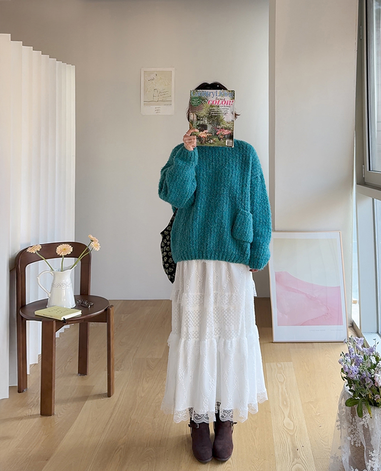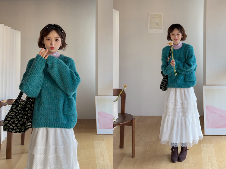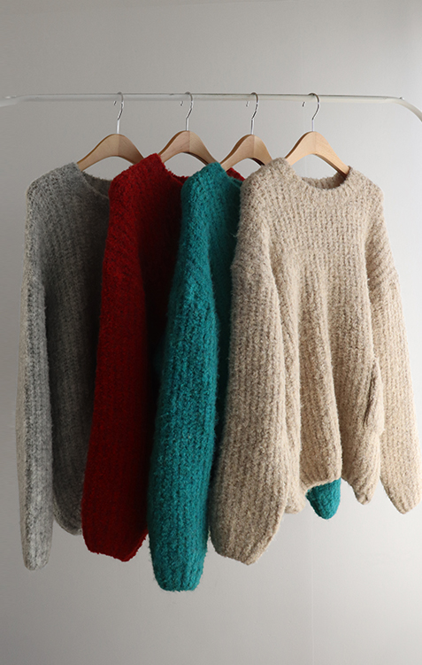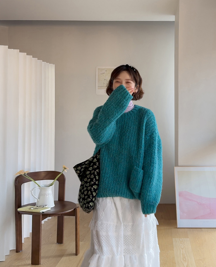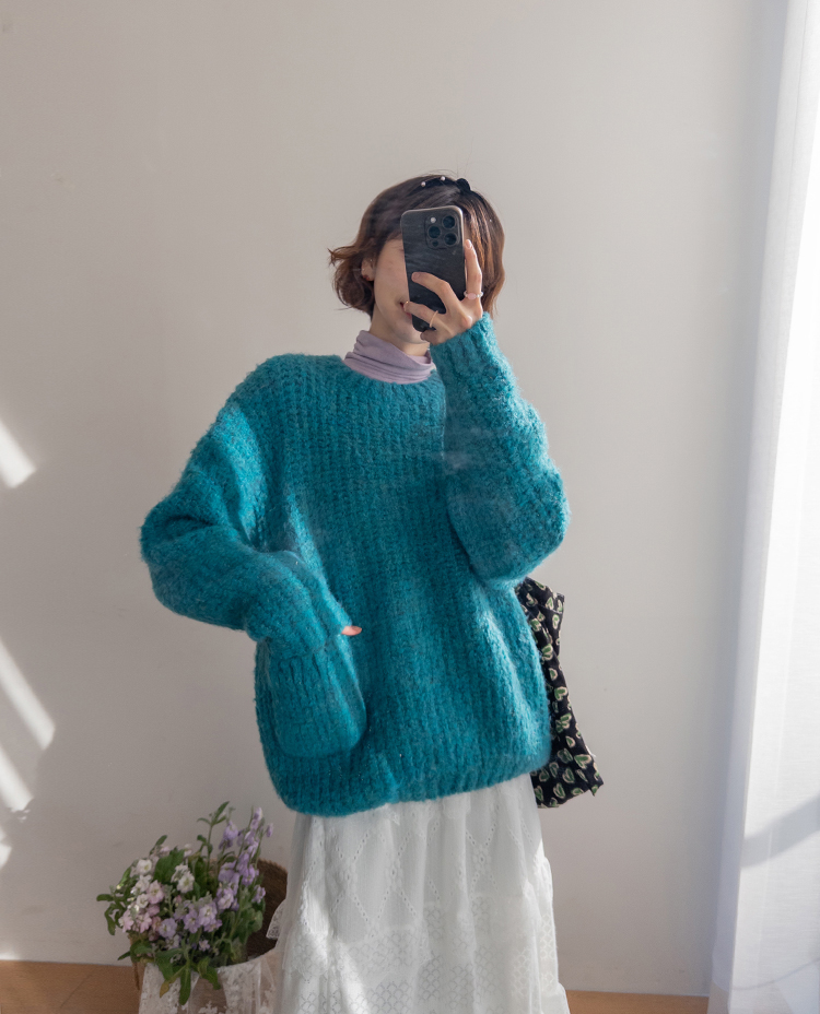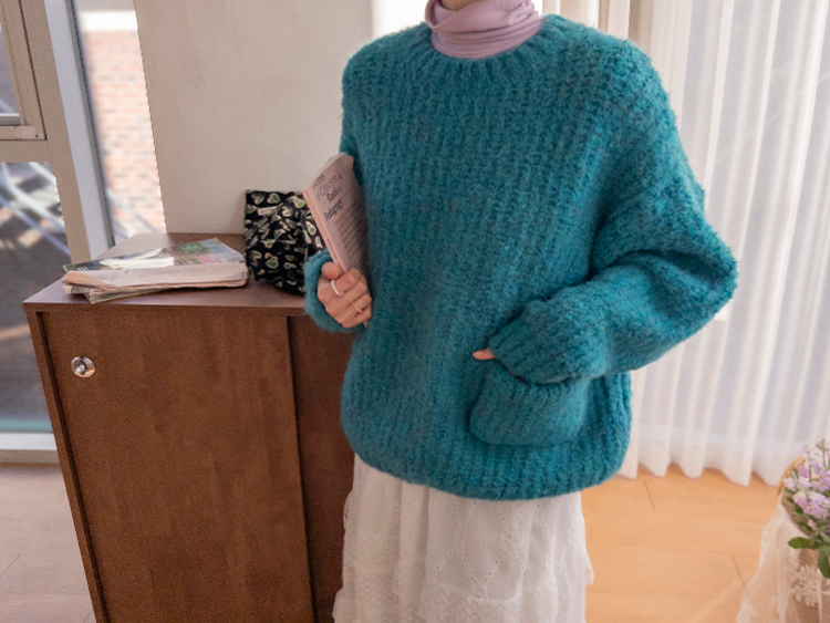 몽글몽글한 컬러감이 매력적인 니트 보여드릴게요♡ 루즈하게 떨어지는 핏으로 상체 여기저기 군살을 자연스럽게 커버해준답니다 한쪽에만 포켓을 더해주어 귀여운 포인트 UP! 간단한 수납까지 가능해요! 오묘하면서도 따뜻한 컬러감으로 기본 팬츠에 이 니트만 걸치셔서 포근한 겨울감성룩으로 스타일링하시길 추천드릴게요 ;D