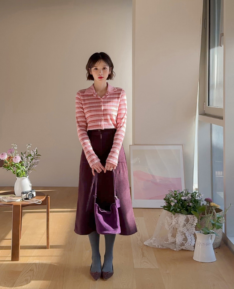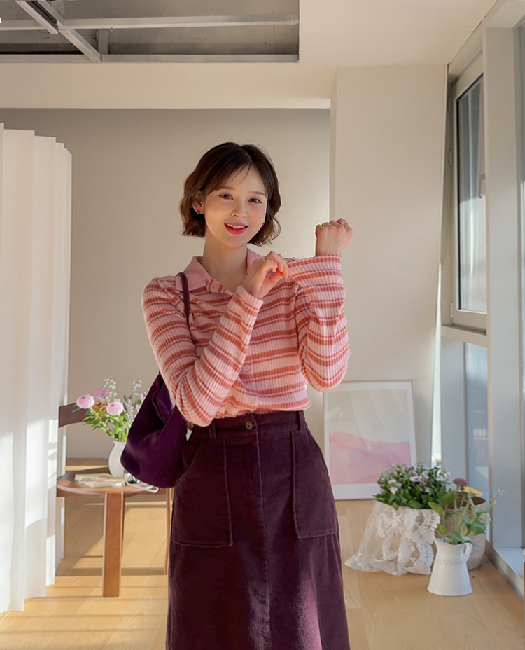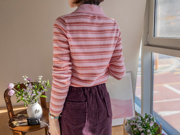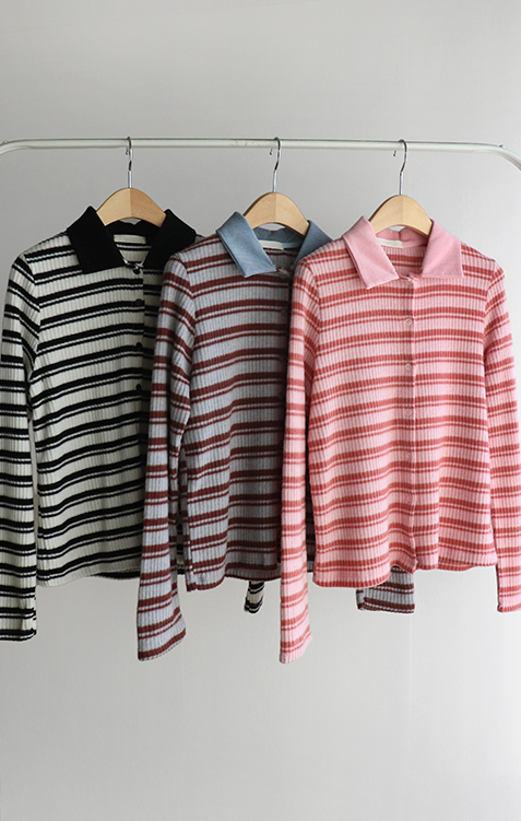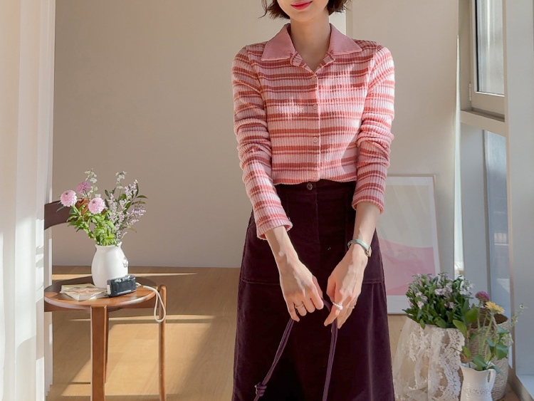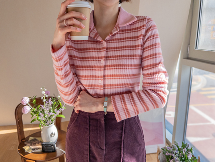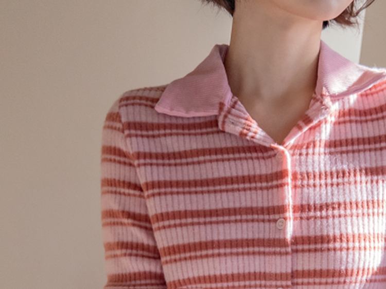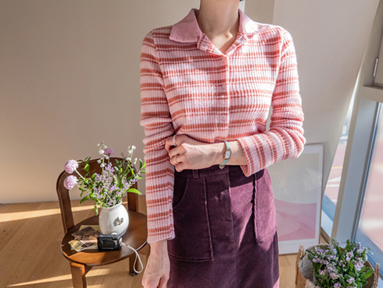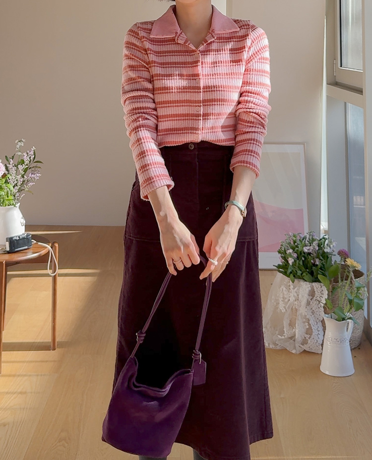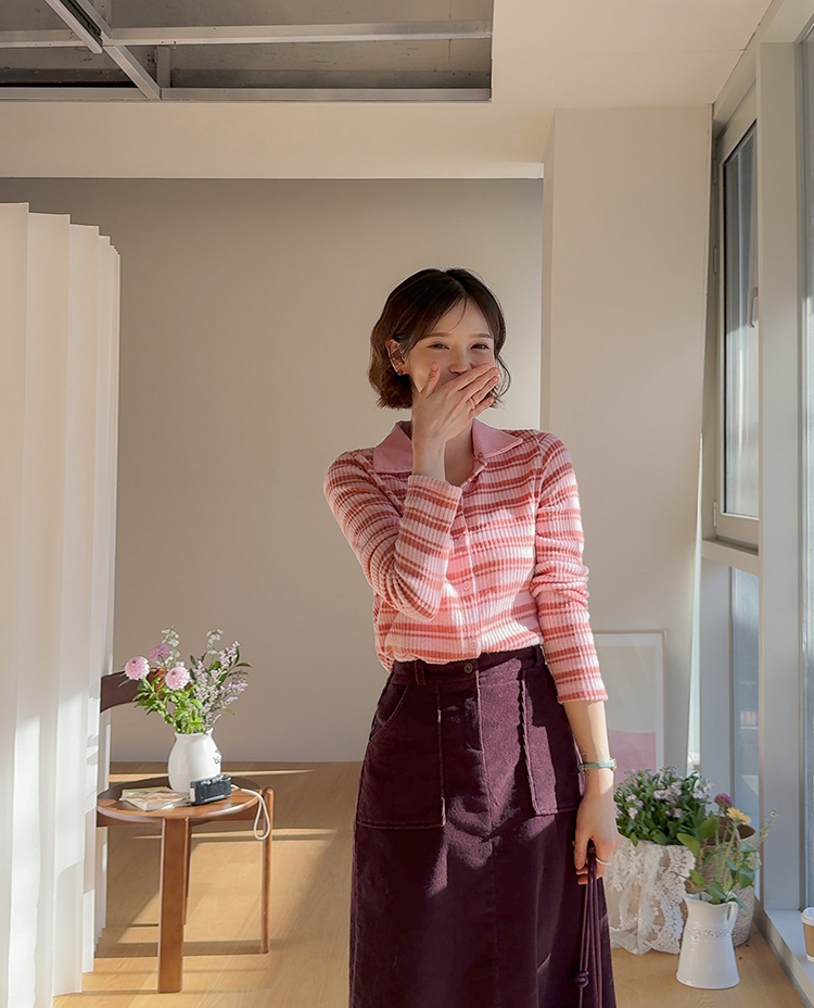 룩에 경쾌한 포인트가 되어 주는 스트라이프 패턴의 카라 가디건 보여 드려요! 통통! 튀는 색감이 돋보이며 발랄한 분위기를 완성해 주는 아이템으로 강추! 드려요^,^ 잔잔한 세로 골지 디자인이라 늘씬~한 라인 완성 ☆ 화사한 컬러감으로 얼굴이 환해 보인답니다! 겨울엔 물론, 간절기 시즌까지 쭉- 즐기기 좋은 사랑스러움 가득 담긴 가디건 강추 드릴게요~♡