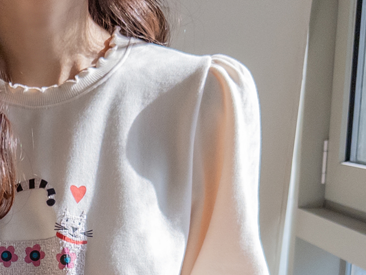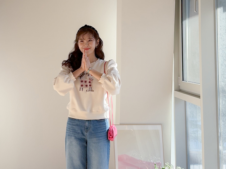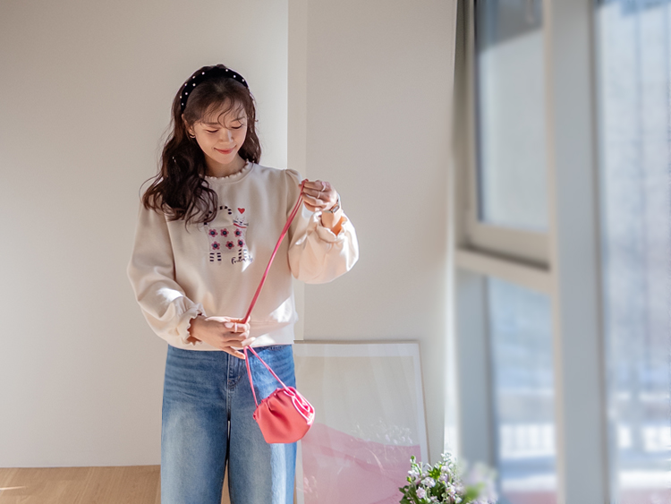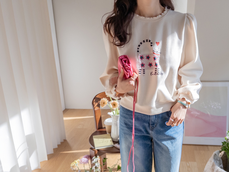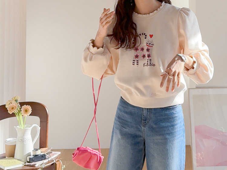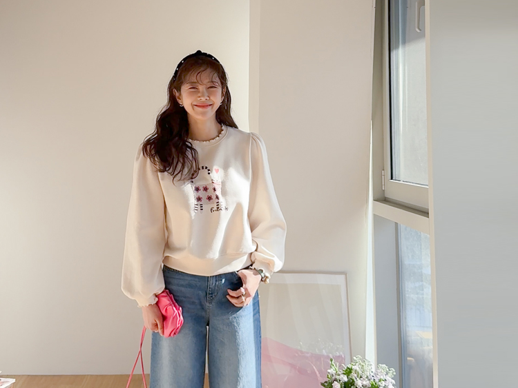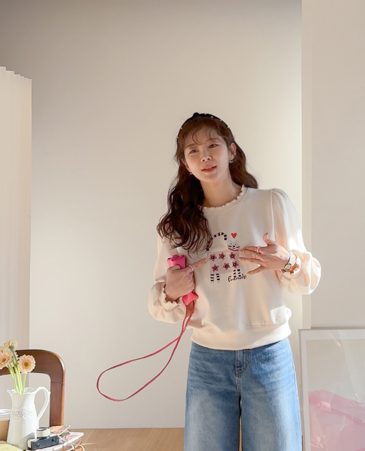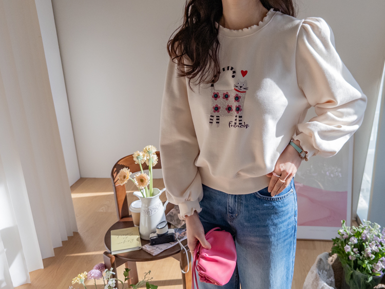 부드러운 속기모로 한겨울엔 아우터안에 쏙~ 따뜻하게 입기 좋구요~ 맨투맨이라고 후줄근~해 보이지 않은 포인트들이 넘 유니크해서 소장 가치 높은↑아이템인데요~ 소매와 넥라인에 프릴 블라우스를 입은듯~ 웨이브를 주어 더욱 사랑스럽게! 또, 여유로운 품과 어깨 셔링으로 미운 군살을 쏘옥~ 가려주어 고마운 아이템 ㅎㅎ 사랑스러운 냥이 프린팅으로 포인트 톡!톡! 하니~ 굿초이스 해주세요 ^^