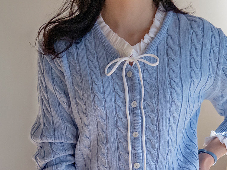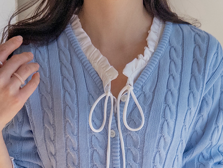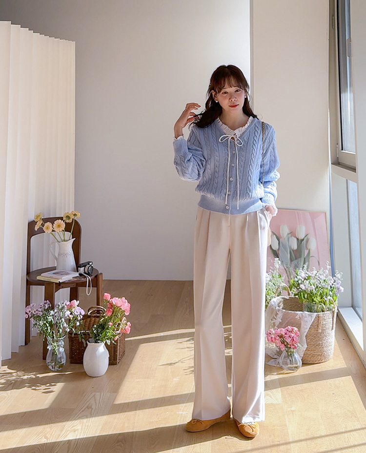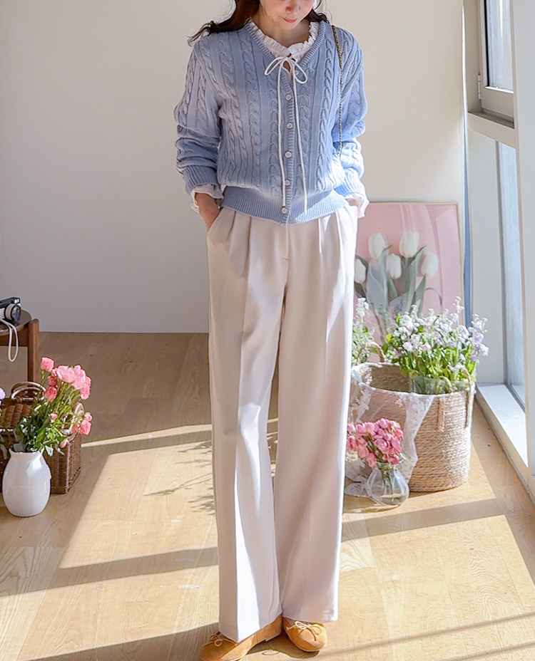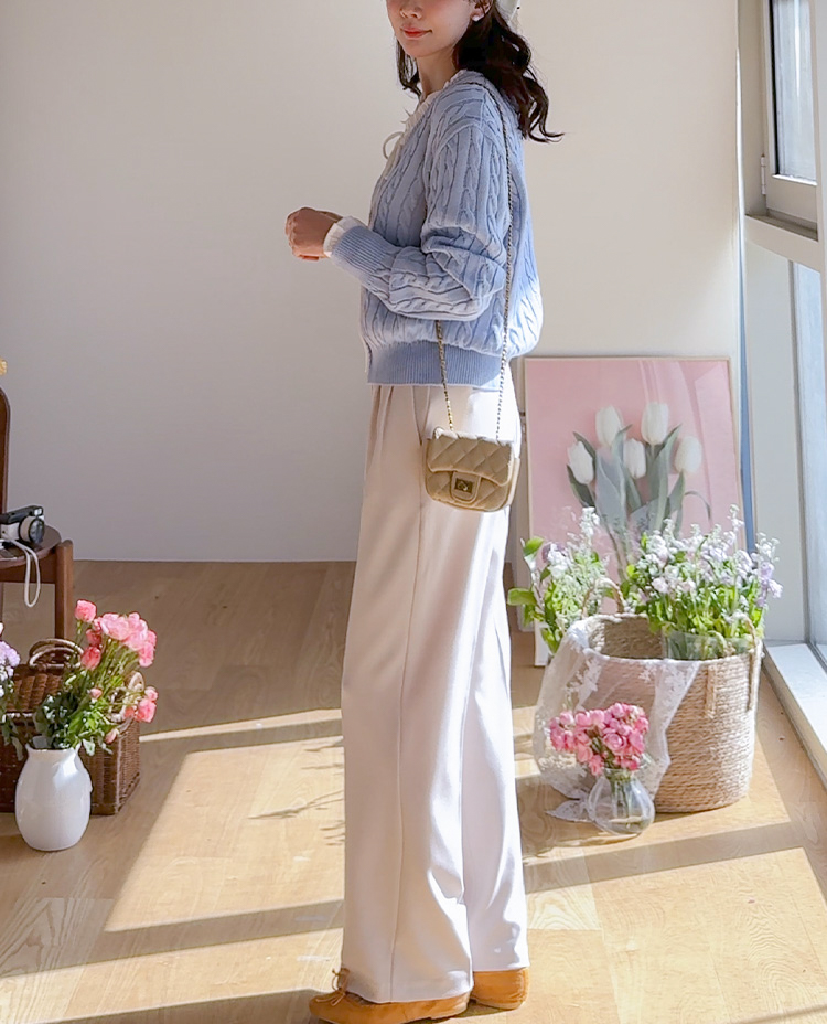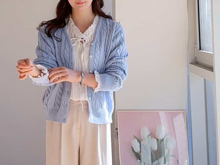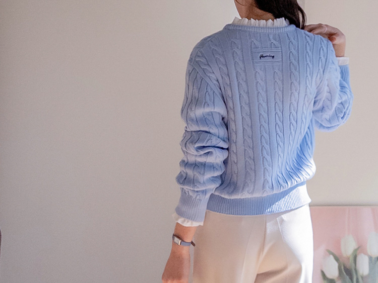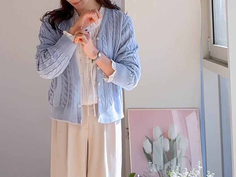 다가오는 계절에 즐기기 좋은 케이블 니트 소개드려요 ~ 꽈배기 짜임으로 부담스럽지 않은 브이넥 라인이 어떤 이너템이랑도 매치가 좋아 더욱 손이 자주 가는데요~ 기본 케이블니트 같지만 백포인트로 자수 디테일이 더해져~ 감각적인 무드까지,,♥ 적당히 스탠다드한 실루엣이 모델언니처럼 슬랙스도 좋구요~ 데님/스커트/원피스 다~ 잘 어울리니 굿초이스 해주세요 ^^