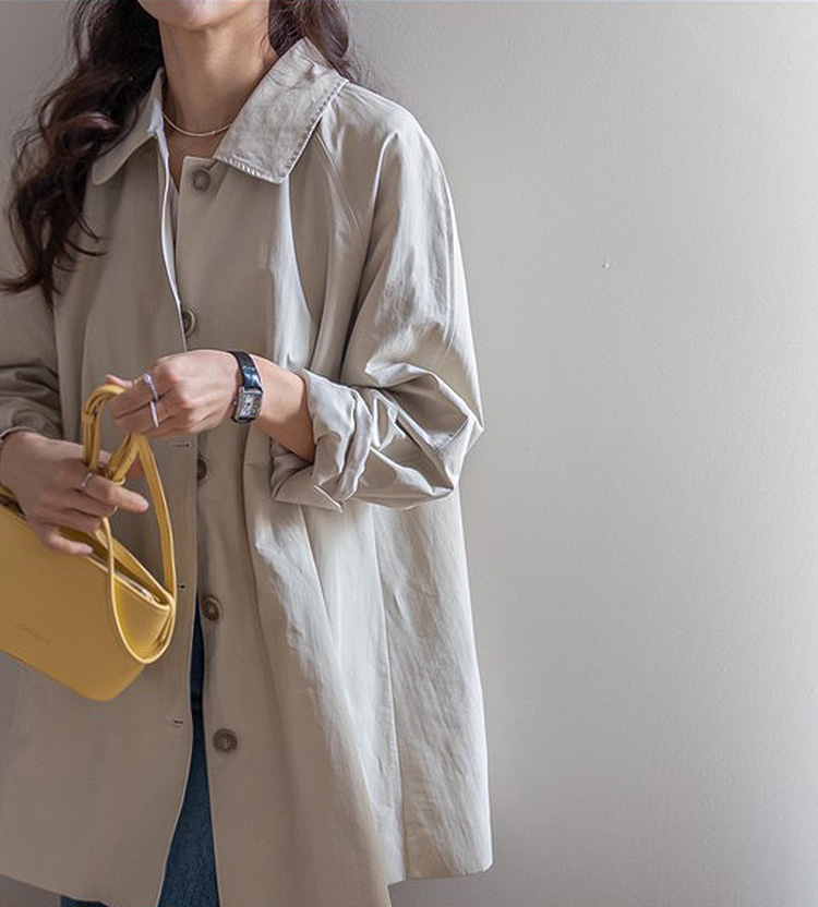 간절기 시즌 가볍게 걸치기 좋은 하프 트렌치 코트 소개드려요 ^^ 라글란 소매 디자인으로 어깨 라인이 자연스럽게 떨어지면서 부드럽고 여리한 실루엣을 연출해주고요, 싱글 여밈 디자인으로 군더더기 없이 깔끔하게 떨어져 데일리하게 활용하기 좋은 아이템이에요. 소매에는 비조 디테일을 더해 핏을 조절할 수 있으며 뒷중심에도 비조 장식을 더해 은은한 트렌치 감성을 살려주었어요. 뒷중심 맞턱 디테일로 움직일 때마다 자연스럽게 훌이 퍼져 전체적으로 A라인 실루엣이 예쁘게 연출되는 데일리 아우터로 추천드릴게요 ♥