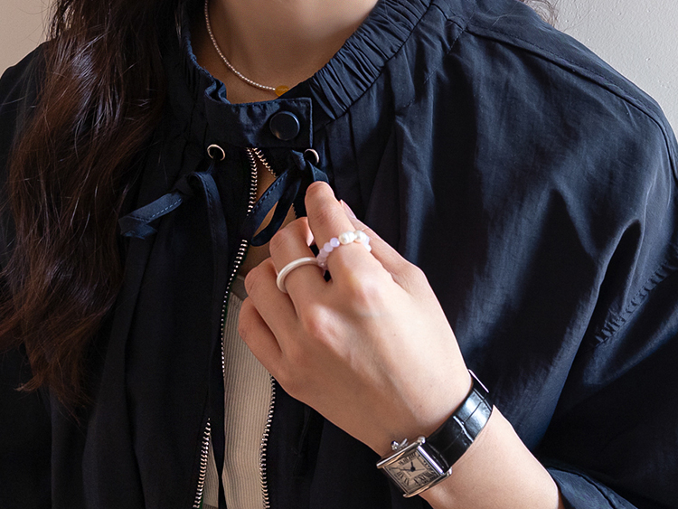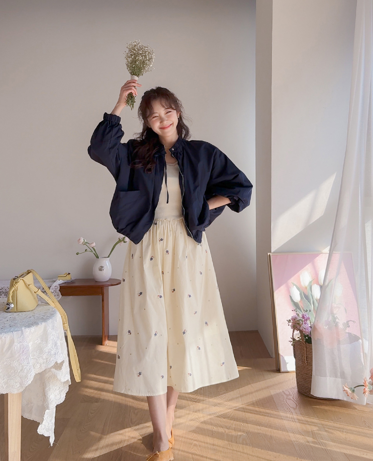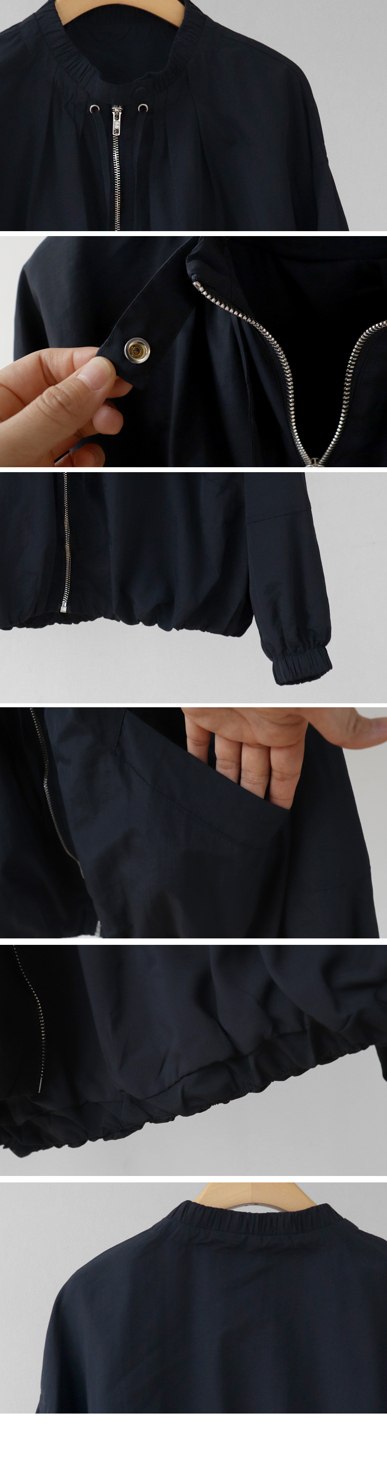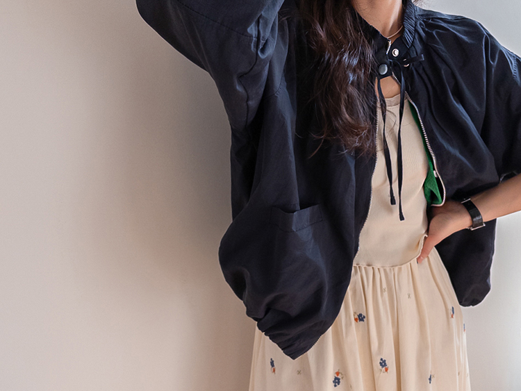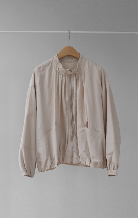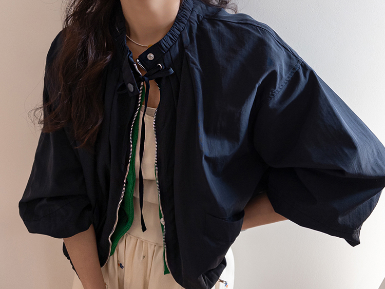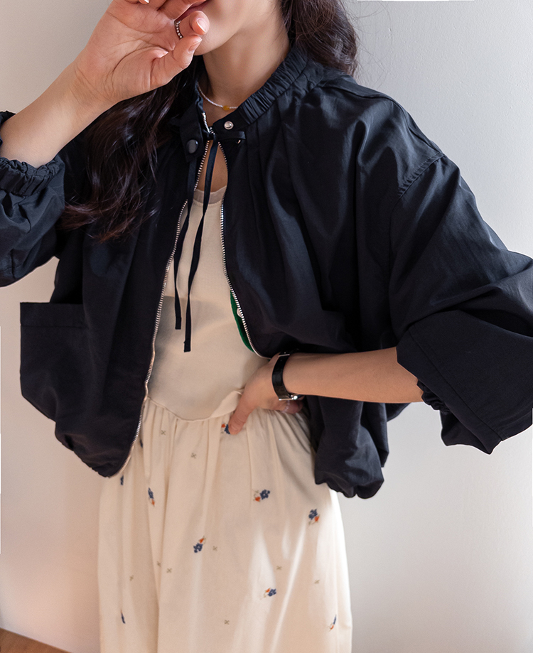 디테일이 돋보이는 블루종 점퍼 소개드려요 ^^ 전체적으로 여유 있게 떨어지는 핏에 밑단이 자연스럽게 모아지는 블루종 실루엣으로 입었을 때 볼륨감이 예쁘게 살아나는 아이템이에요. 가장 큰 포인트는 넥라인에 더해진 스트링 + 스냅 버튼 디테일로 셔링이 잡힌 넥라인이 자연스럽게 주름지며 은은하게 여성스러운 분위기를 만들어주고요, 지퍼 여밈과 함께 스트링을 조절해 연출하면 넥라인 핏을 다양하게 변화시킬 수 있어 스타일링의 폭을 넓혀줍니다. 소매는 자연스럽게 볼륨이 잡히는 핏에 밑단과 함께 전체적으로 둥글게 떨어져 부드러운 실루엣을 완성해주며 캐주얼하면서도 여성스러운 무드가 느껴져요. 가볍고 드라이한 터치감의 소재로 간절기에 부담 없이 걸치기 좋고 원피스, 스커트, 데님과 함께 다양하게 매치하기 좋은 점퍼로 추천드릴게요 ♥