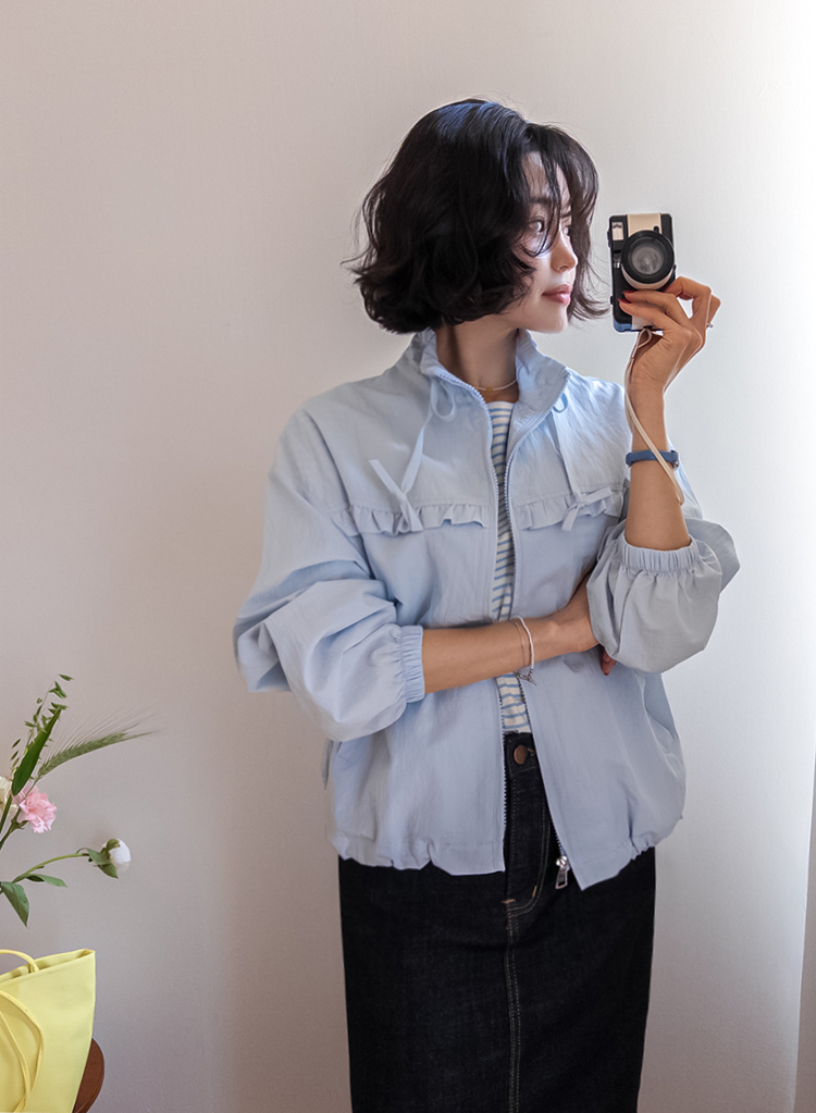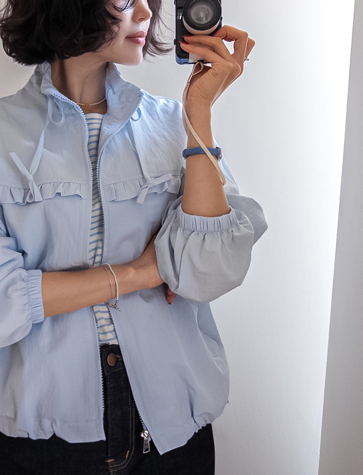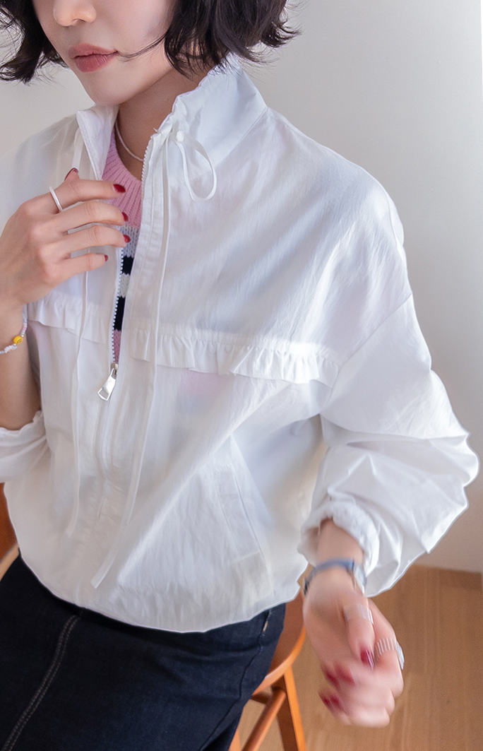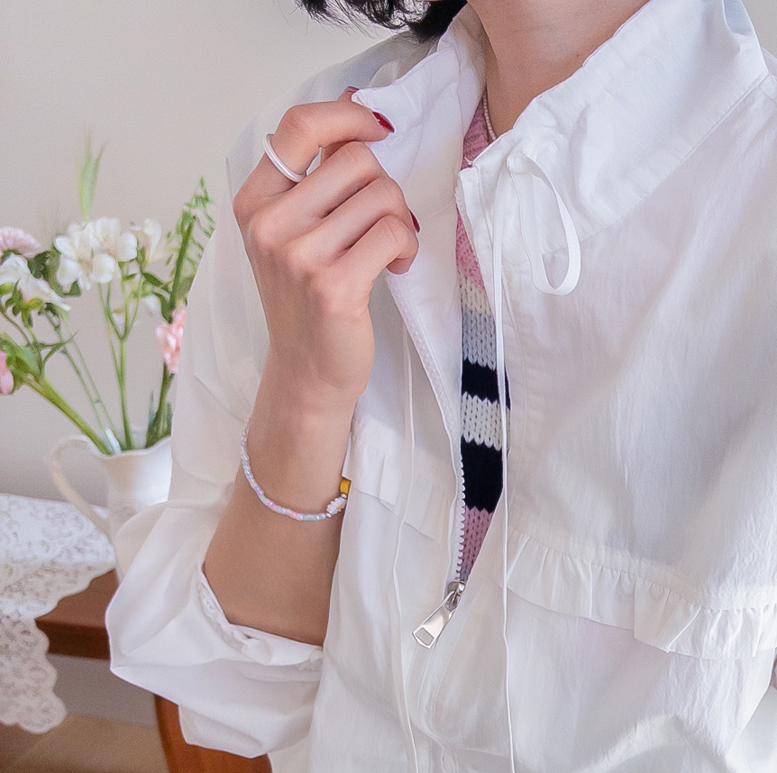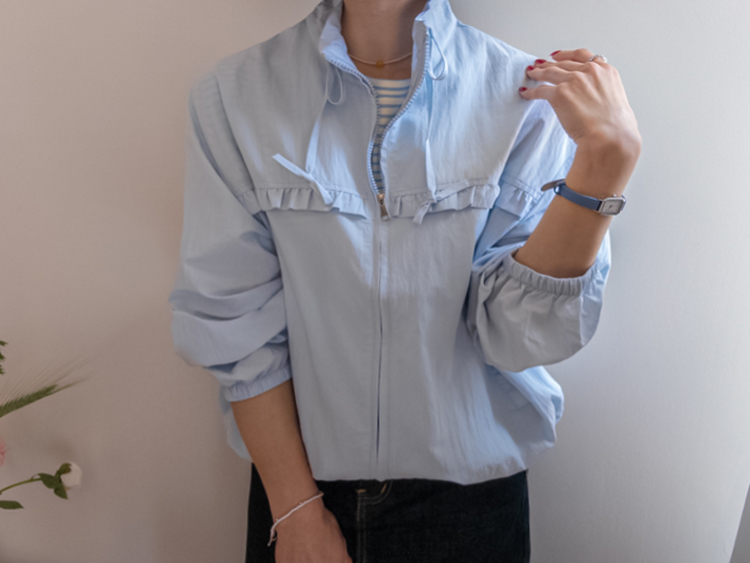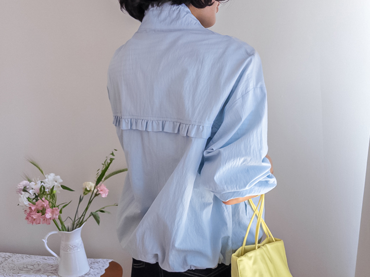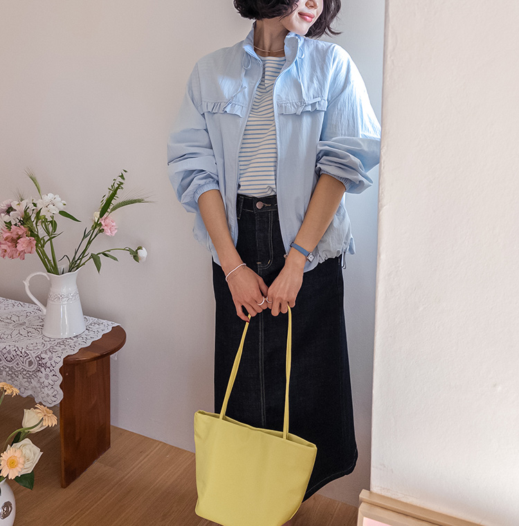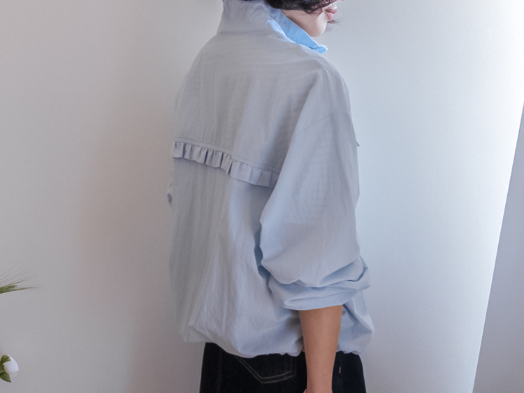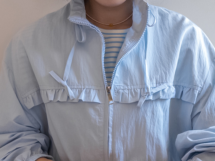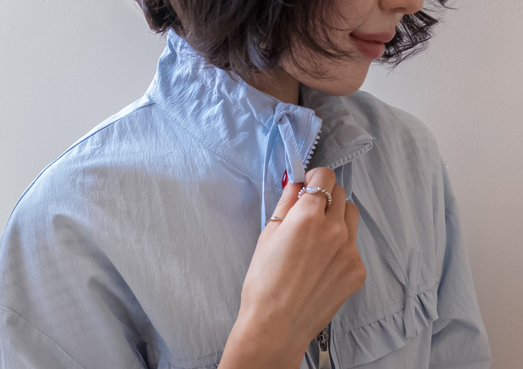 가볍게 걸치기 좋은 하이넥 점퍼 소개드려요 ^^ 전체적으로 코튼 혼방 소재로 부드러우면서도 가볍게 떨어지는 텍스처라 부담 없이 데일리로 입기 좋은 아이템이에요. 너무 힘있는 원단이 아니라 자연스럽게 유연하게 떨어지면서도 형태는 깔끔하게 잡아주는 느낌이고요, 넥라인은 하이넥 디자인에 스트링 디테일이 더해져 올려서 연출하면 단정하게, 풀어서 입으면 내추럴한 무드로 연출할 수 있어요. 가슴 라인에는 잔잔한 셔링 디테일이 들어가 은은하게 포인트가 되어주며 앞, 뒤 모두 디테일이 살아 있어요. 소매와 밑단 밴딩으로 입었을 때 자연스럽게 볼륨이 잡히면서 편안하고 안정감 있는 핏을 만들어줍니다. 데일리로 가볍게 걸치기 좋은 활용도 높은 아우터로 추천드릴게요 ♥