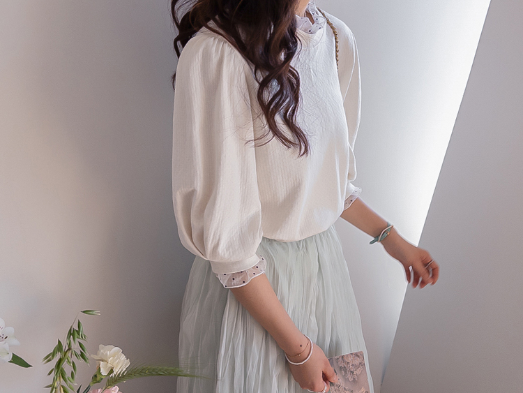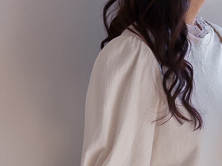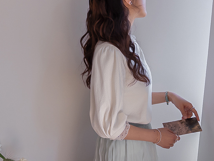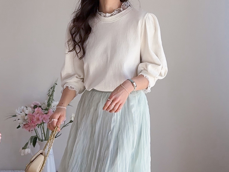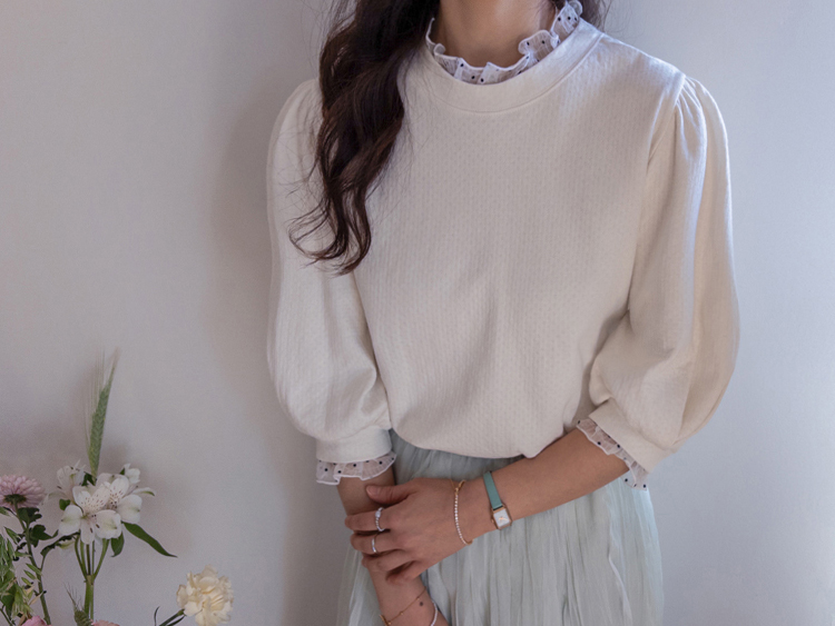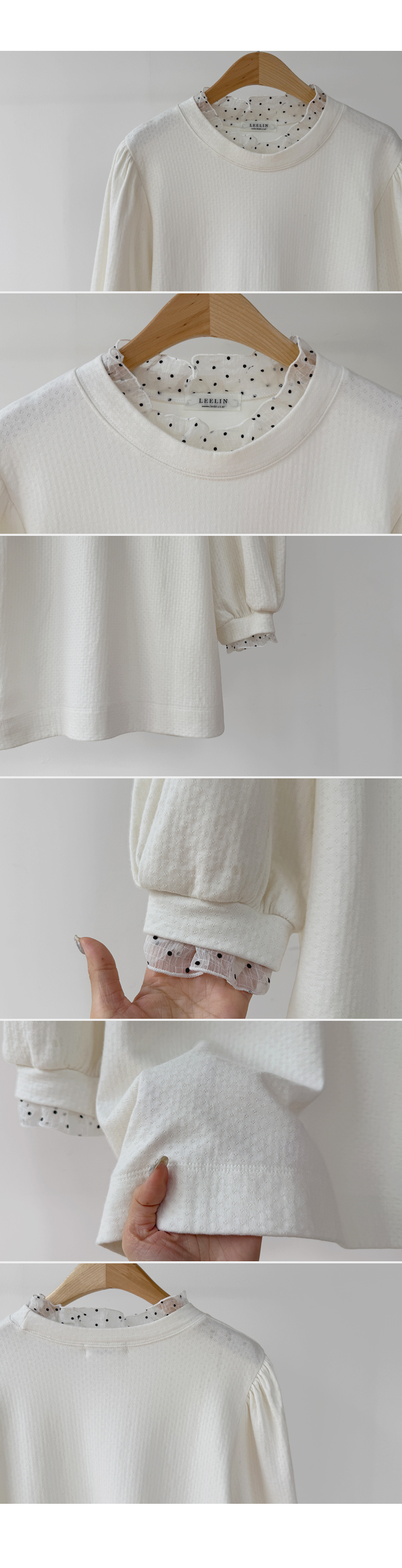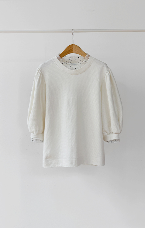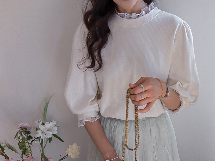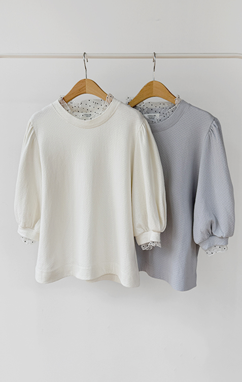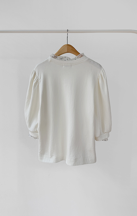 베이직한 맨투맨에 로맨틱한 디테일을 더한 아이템이에요 :) 넥라인과 소매 끝에는 잔잔한 도트 쉬폰 원단을 셔링 잡아 덧대어 살짝 올라오는 프릴 디테일이 은은하게 포인트가 되어줘요. 레이어드한 듯한 느낌으로 단독 착용만으로도 완성도 있는 스타일링이 가능해요. 소매는 퍼프 7부 기장으로 어깨 쪽에는 셔링을 잡아 볼륨을 주고, 소매 끝에는 턱 디테일로 한 번 더 잡아주어 둥글고 여성스러운 실루엣을 만들어줘요. 전체적으로는 편안한 맨투맨이지만 디테일 덕분에 단정하면서도 살짝 꾸민 듯한 무드로 연출되는 아이템이에요 ♥