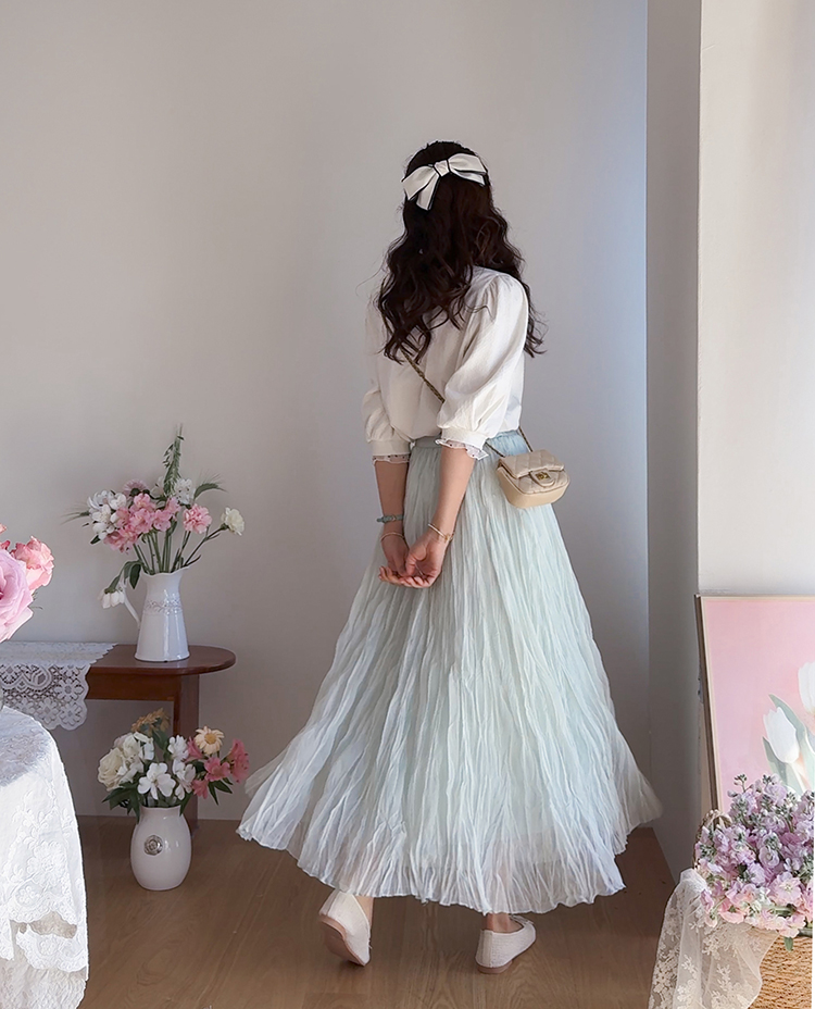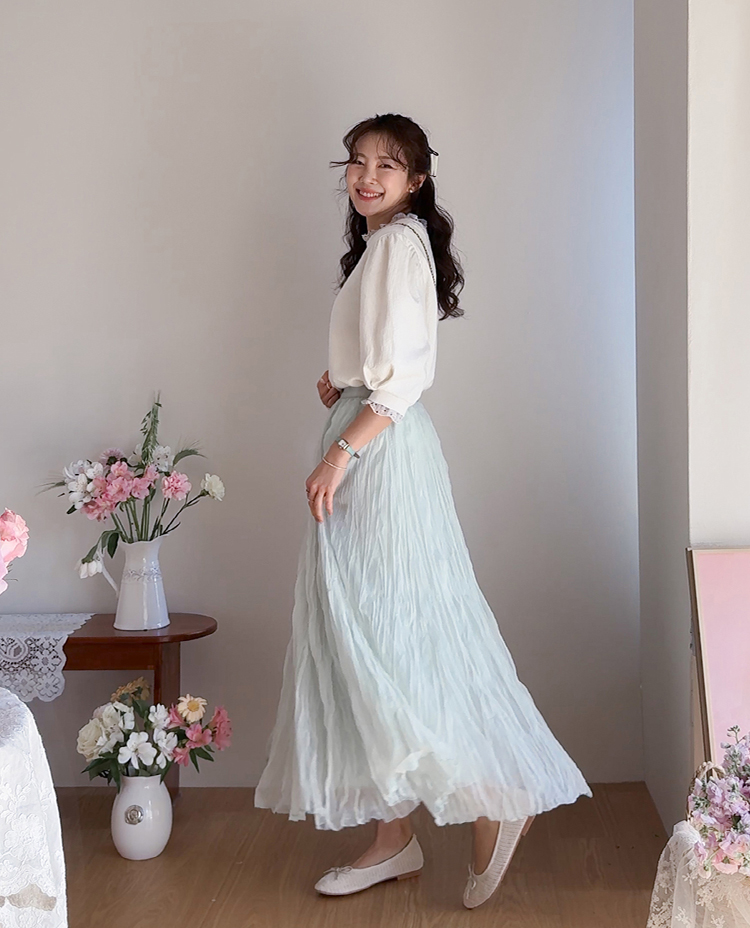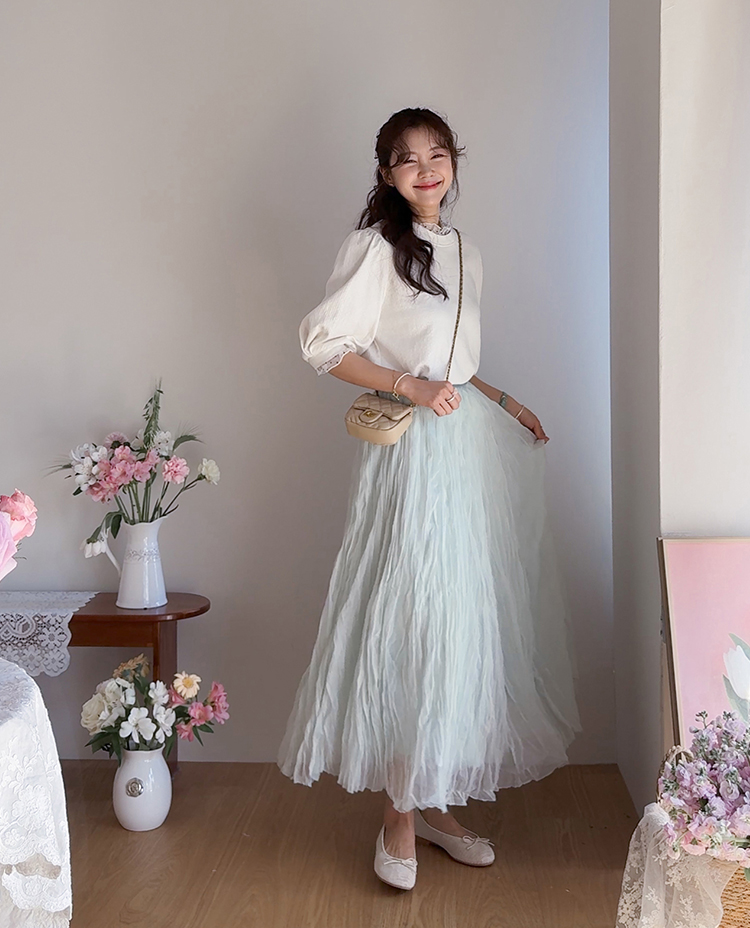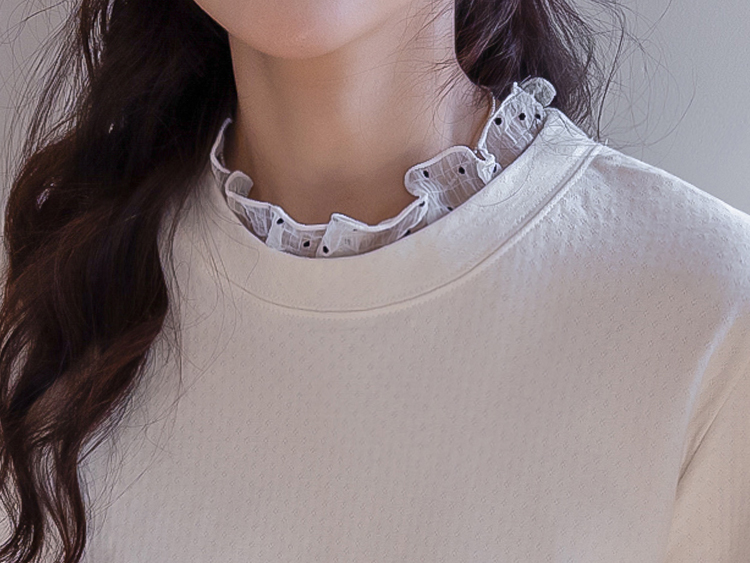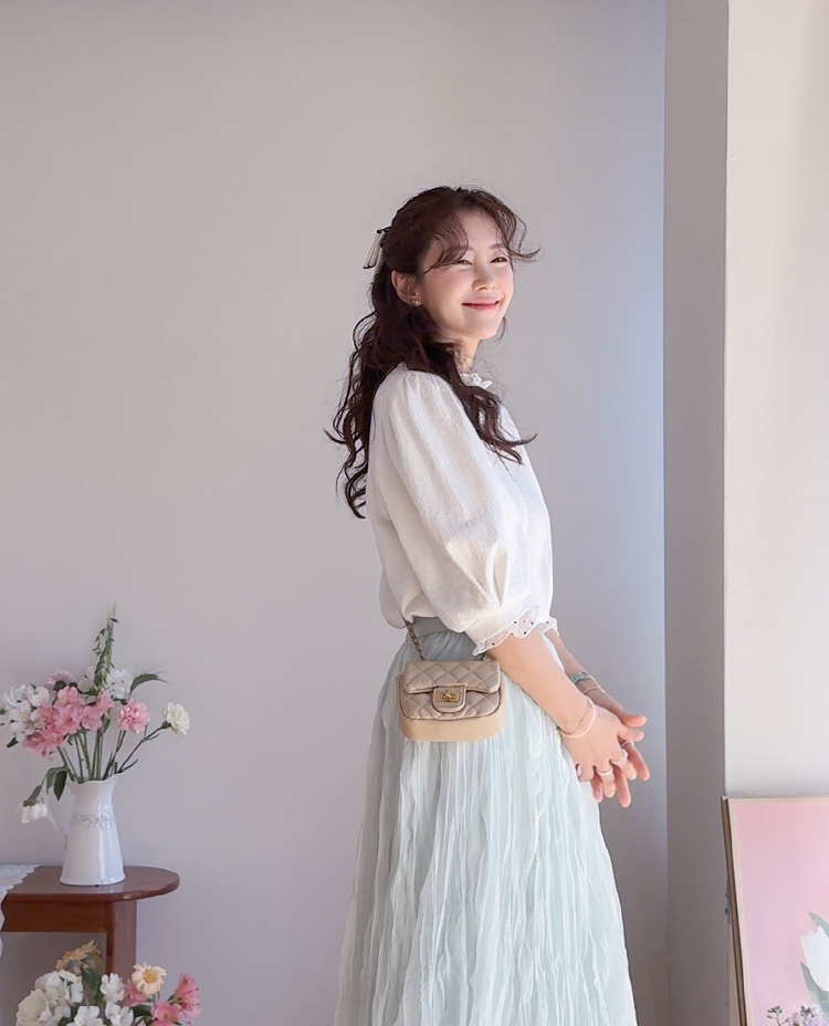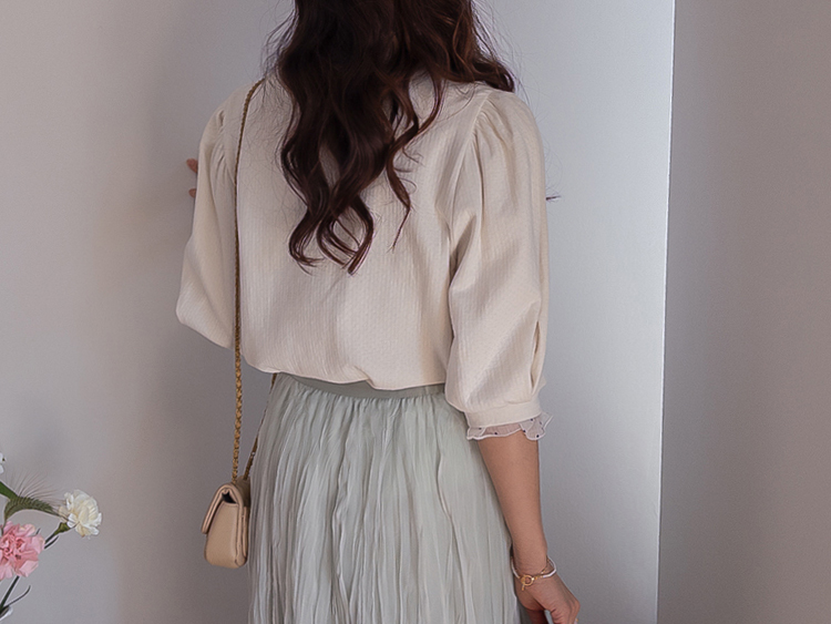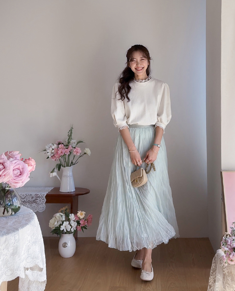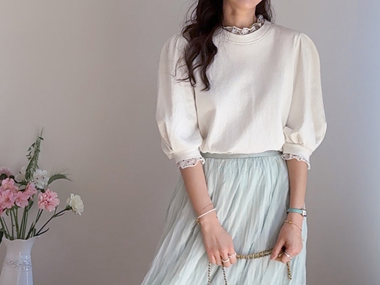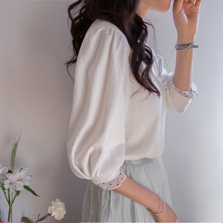 베이직한 맨투맨에 로맨틱한 디테일을 더한 아이템이에요 :) 넥라인과 소매 끝에는 잔잔한 도트 쉬폰 원단을 셔링 잡아 덧대어 살짝 올라오는 프릴 디테일이 은은하게 포인트가 되어줘요. 레이어드한 듯한 느낌으로 단독 착용만으로도 완성도 있는 스타일링이 가능해요. 소매는 퍼프 7부 기장으로 어깨 쪽에는 셔링을 잡아 볼륨을 주고, 소매 끝에는 턱 디테일로 한 번 더 잡아주어 둥글고 여성스러운 실루엣을 만들어줘요. 전체적으로는 편안한 맨투맨이지만 디테일 덕분에 단정하면서도 살짝 꾸민 듯한 무드로 연출되는 아이템이에요 ♥