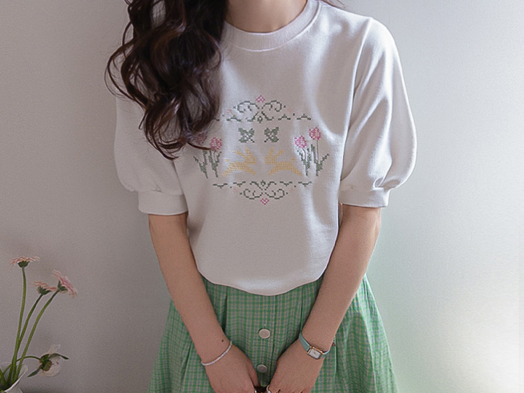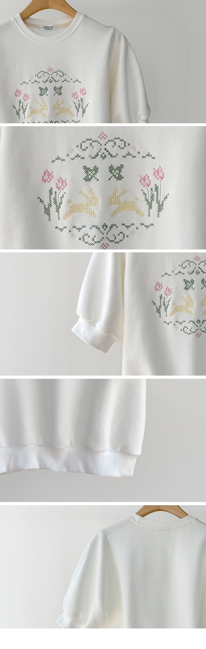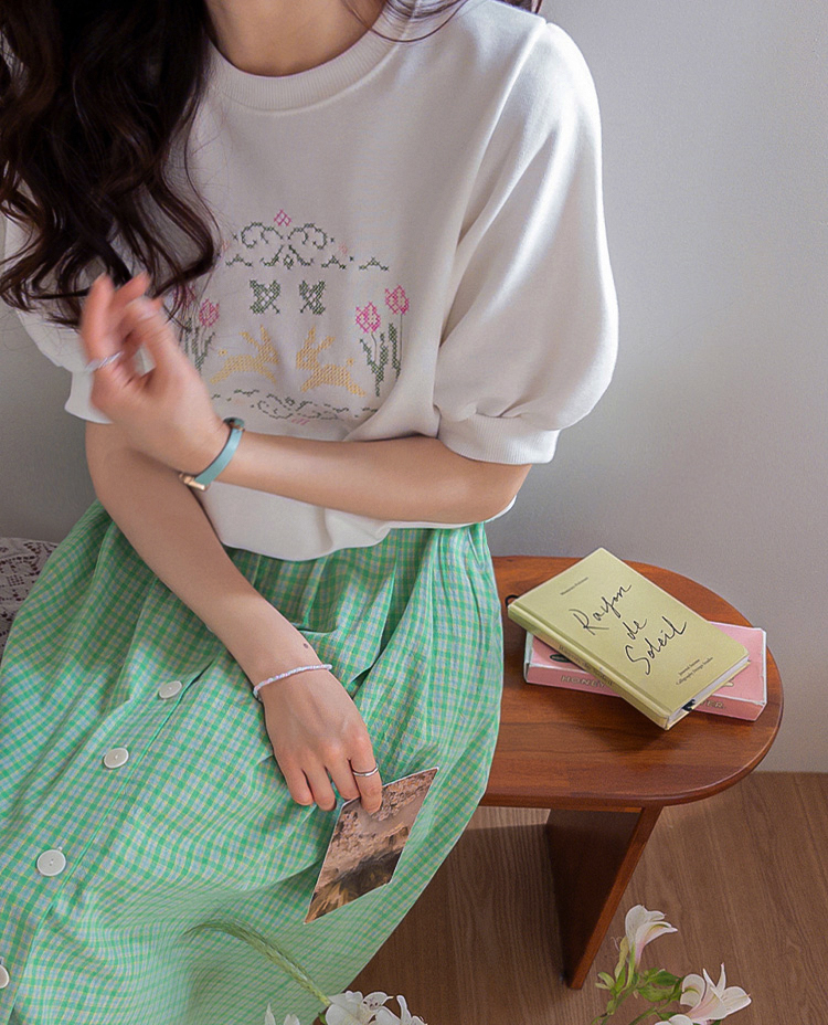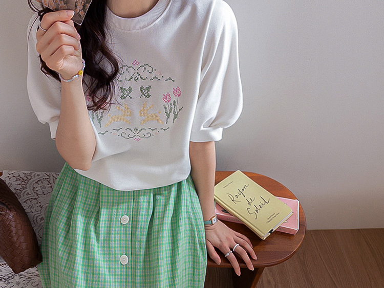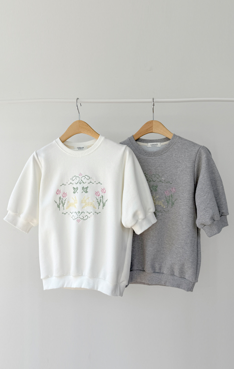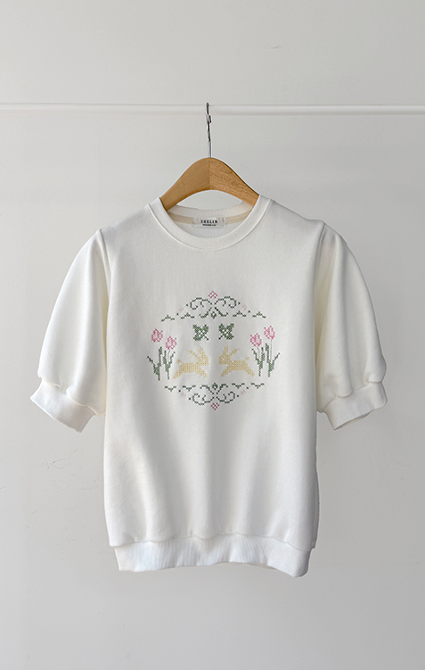 편안하면서도 포인트 있게 입기 좋은 반팔 맨투맨 소개드려요 :) 전체적으로 깔끔한 맨투맨 디자인에 앞면에는 꽃과 토끼를 담은 듯한 십자수 모티브가 더해져 빈티지하면서도 사랑스러운 분위기를 연출해주는 아이템이에요. 프린트가 아니라 수놓은 듯한 크로스스티치 감성의 디테일이라 더욱 따뜻하고 아기자기한 무드가 느껴지고요, 소매는 자연스럽게 볼륨이 살아나는 퍼프 반소매 디자인으로 캐주얼한 맨투맨에 여성스러운 실루엣을 더해줍니다. 데님과 매치하면 편안하게, 스커트와 함께하면 더 사랑스럽게 연출할 수 있어 데일리로 활용하기 좋은 맨투맨으로 추천드릴게요 ♥