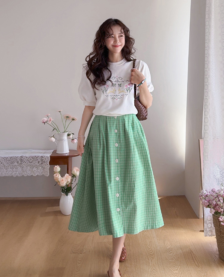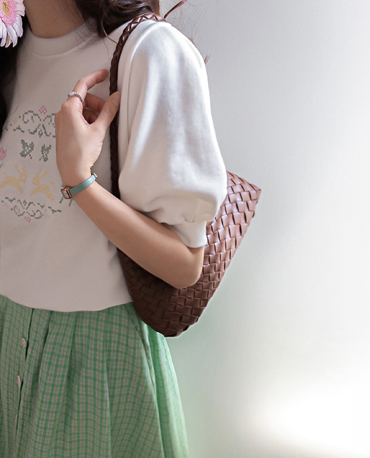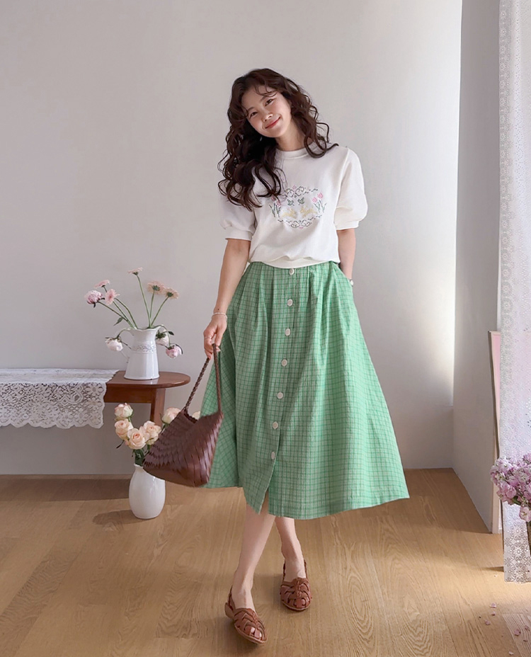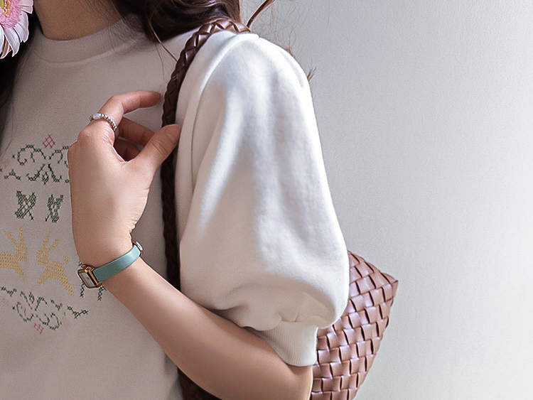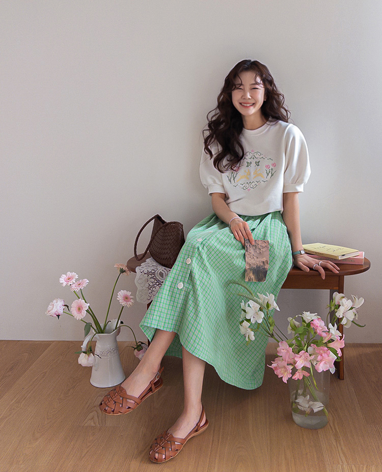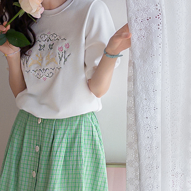 편안하면서도 포인트 있게 입기 좋은 반팔 맨투맨 소개드려요 :) 전체적으로 깔끔한 맨투맨 디자인에 앞면에는 꽃과 토끼를 담은 듯한 십자수 모티브가 더해져 빈티지하면서도 사랑스러운 분위기를 연출해주는 아이템이에요. 프린트가 아니라 수놓은 듯한 크로스스티치 감성의 디테일이라 더욱 따뜻하고 아기자기한 무드가 느껴지고요, 소매는 자연스럽게 볼륨이 살아나는 퍼프 반소매 디자인으로 캐주얼한 맨투맨에 여성스러운 실루엣을 더해줍니다. 데님과 매치하면 편안하게, 스커트와 함께하면 더 사랑스럽게 연출할 수 있어 데일리로 활용하기 좋은 맨투맨으로 추천드릴게요 ♥
